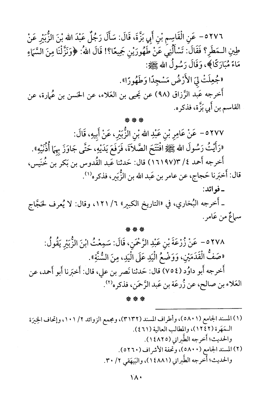 ٥٢٧٦ - عن القاسم بن أبي بزة، قال: سأل رجل عبد الله بن الزبير عن طين المطر؟ فقال: تسألني عن طهورين جميعا؟! قال الله: {ونزلنا من السماء ماء مباركا}، وقال رسول الله صَلى الله عَليه وسَلم: