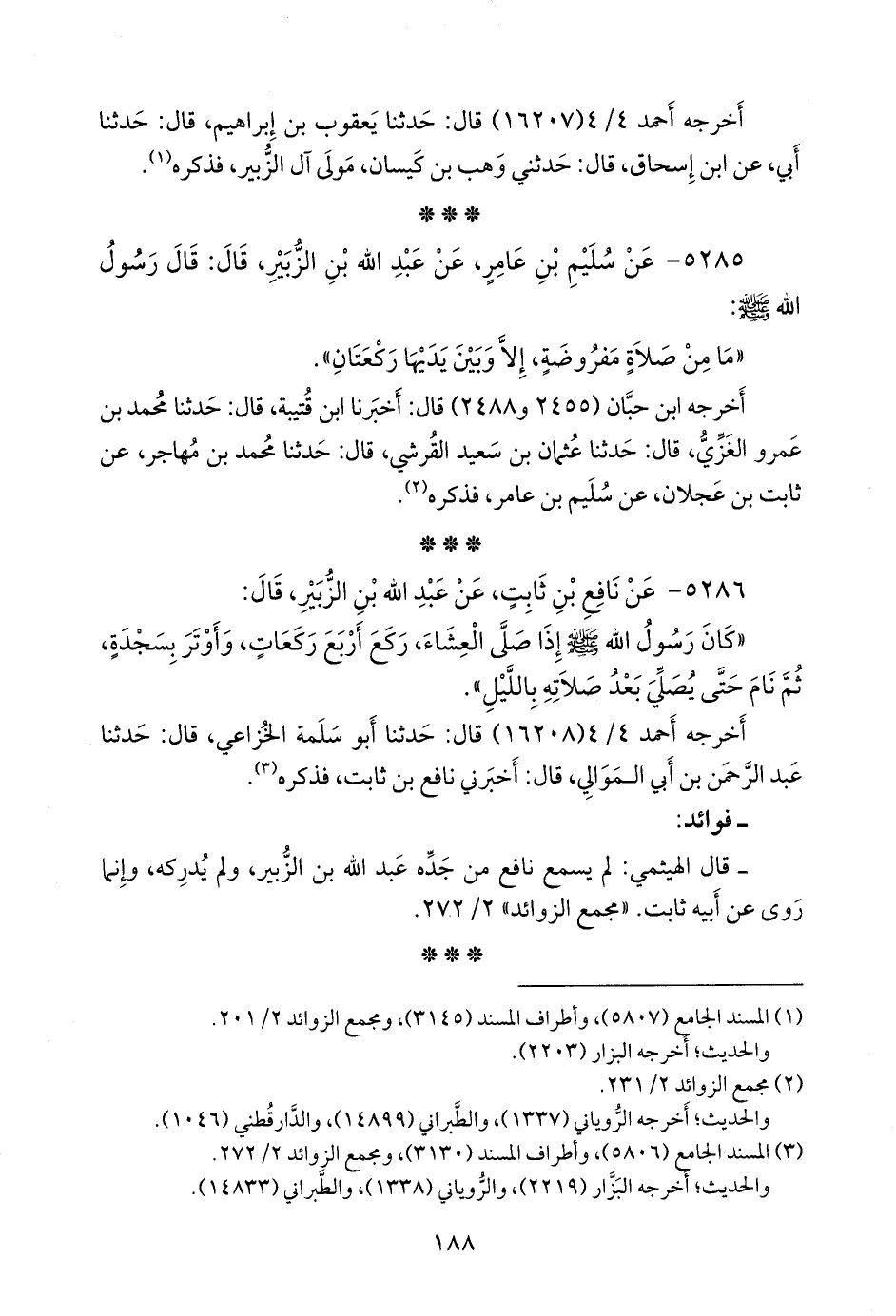 - قلنا: إسناده ضعيفٌ؛ قال الهيثمي: لم يسمع نافع من جده عبد الله بن الزبير، ولم يدركه، وإنما روى عن أبيه ثابت. «مَجمَع الزوائد» ٢/ ٢٧٢.