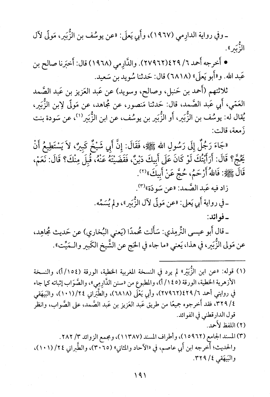 (¬١) قوله: «عن ابن الزبير» لم يرد في النسخة المغربية الخطية، الورقة (١٥٤/ أ)، والنسخة الأزهرية الخطية، الورقة (١٤٥/ أ)، والمطبوع من «سنن الدَّارِمي»، والصواب إثباته كما جاء في روايتي أحمد (٢٧٩٦٢)، وأبي يَعلى (٦٨١٨)، والطبراني ٢٤/ (١٠١)، والبيهقي ٤/ ٣٢٩، فقد أخرجوه جميعا من طريق عبد العزيز بن عبد الصمد، على الصواب، وانظر قول الدارقُطني في الفوائد.
