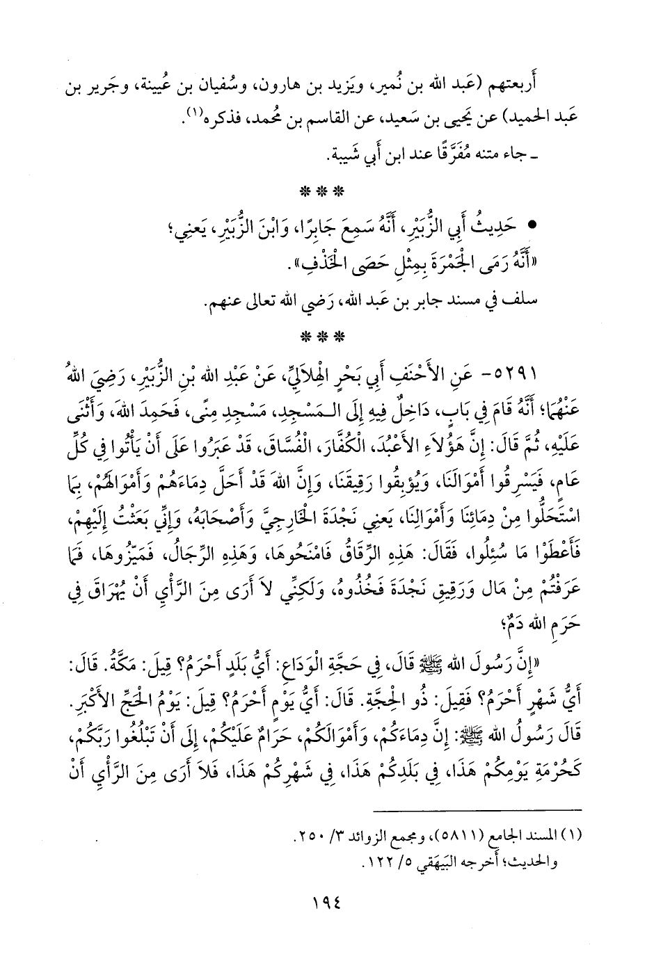 ٥٢٩١ - عن الأحنف أبي بحر الهلالي، عن عبد الله بن الزبير، أَنه قام في باب داخل فيه إِلى المسجد، مسجد منى، فحمد الله، وأَثنى عليه، ثم قال: إِن هؤلاء الأَعبد الكفار الفساق قد عمدوا على ... وذكر الحديث (¬١) أَن يأتوا في كل عام، فيسرقوا أَموالنا، ويؤبقوا رقيقنا، وإِن الله قد أَحل دماءهم وأَموالهم، بما استحلوا من دمائنا وأَموالنا، يعني نجدة الخارجي وأَصحابه، وإِني بعثت إِليهم، فأَعطوا ما سئلوا، فقال: هذه الرقاق فامنحوها، وهذه الرجال فميزوها، فما عرفتم من مال ورقيق نجدة فخذوه، ولكني لا أَرى من الرأي أَن يهراق في حرم الله دم؛