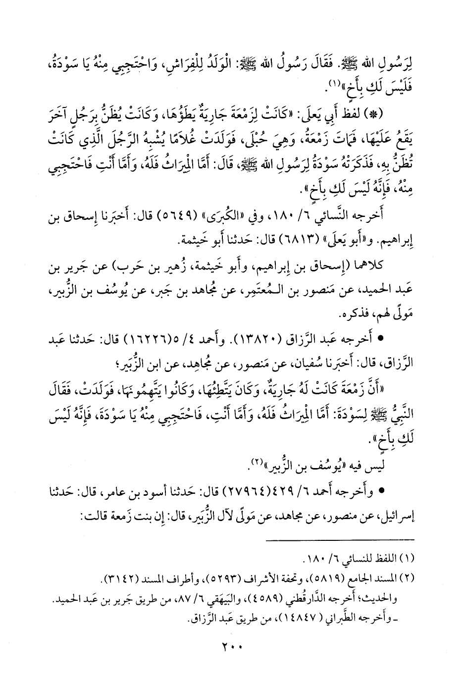 «أتيت رسول الله صَلى الله عَليه وسَلم فقلت: إن أبي زمعة مات وترك أم ولد له، وإنا كنا نظنها برجل، وإنها ولدت فخرج ولدها يشبه الرجل الذي ظنناها به، قال: فقال صَلى الله عَليه وسَلم لها: أما أنت فاحتجبي منه، فليس بأخيك، وله الميراث».
