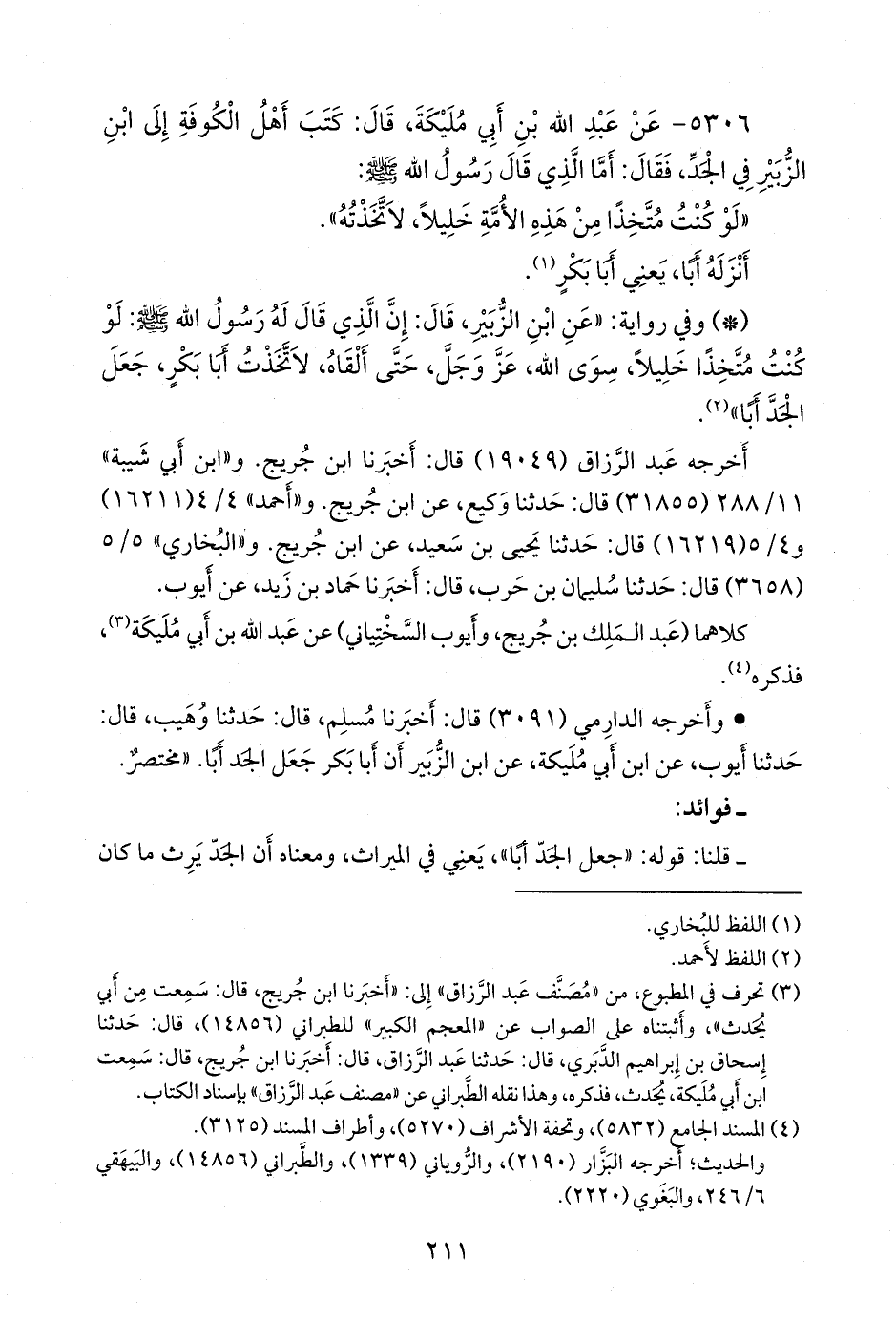 ٥٣٠٦ - عن عبد الله بن أَبي مُليكة، قال: كتب أهل الكوفة إلى ابن الزبير في الجد، فقال: أما الذي قال رسول الله صَلى الله عَليه وسَلم: