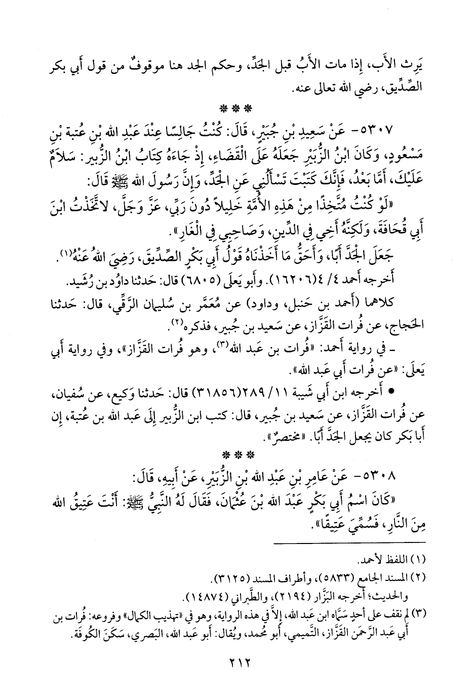 ٥٣٠٧ - عن سعيد بن جبير، قال: كنت جالسا عند عبد الله بن عُتبة بن مسعود، وكان ابن الزبير جعله على القضاء، إذ جاءه كتاب ابن الزبير: سلام عليك، أما بعد، فإنك كتبت تسألني عن الجد، وإن رسول الله صَلى الله عَليه وسَلم قال: