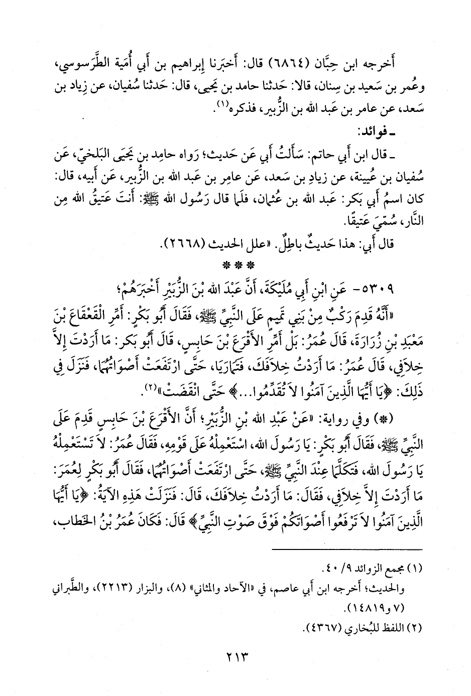 - وفي رواية: «عن عبد الله بن الزبير؛ أن الأقرع بن حابس قدم على النبي صَلى الله عَليه وسَلم فقال أَبو بكر: يا رسول الله، استعمله على قومه، فقال عمر: لا تستعمله يا رسول الله، فتكلما عند النبي صَلى الله عَليه وسَلم حتى ارتفعت أصواتهما، فقال أَبو بكر لعمر: ما أردت إلا خلافي، فقال: ما أردت خلافك، قال: فنزلت هذه الآية: {يا أيها الذين آمنوا لا ترفعوا أصواتكم فوق صوت النبي} قال: فكان عمر بن الخطاب،