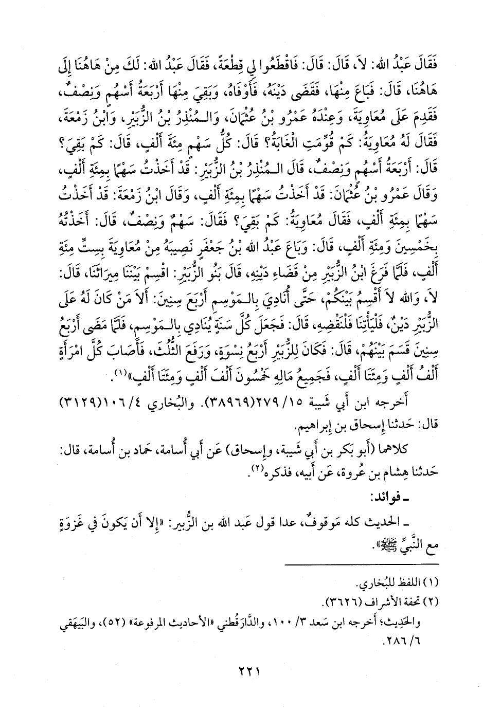 - قال العيني: هذا من أفراد البخاري، وذكره أصحاب «الأطراف» في مسند الزبير، والأشبه أن يكون من مسند ابنه عبد الله، وكله موقوف، غير قوله: «وما ولي إمارة، ولا جباية خراج، ولا شيئًا إلا أن يكون في غزوة مع النبي صَلى الله عَليه وسَلم»، فهذا المقدار في حكم المرفوع، ورواه الإسماعيلي عن جويرية، قال: حدثنا أَبو أُسامة، قال: حدثنا هشام، عن أبيه، عن عبد الله. «عمدة القاري» ١٥/ ٤٨.