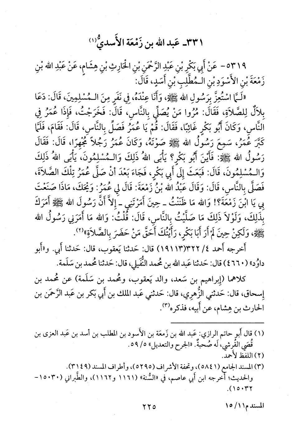 «وقال النبي صَلى الله عَليه وسَلم لعبد الله بن زمعة: مر الناس فليصلوا، فخرج عبد الله بن زمعة، فلقي عمر بن الخطاب، فقال: صل بالناس، فصلى عمر بالناس، فجهر بصوته، وكان جهير الصوت، فسمع رسول الله صَلى الله عَليه وسَلم فقال: أليس هذا صوت عمر؟ قالوا: بلى يا رسول الله، فقال: يأبى الله ذلك والمؤمنون، ليصل بالناس أَبو بكر، فقال عمر لعبد الله بن زمعة: بئس ما صنعت، كنت أرى أن رسول الله صَلى الله عَليه وسَلم أمرك أن تأمرني، قال: لا والله، ما أمرني أن آمر أحدا»، «مُرسَل».