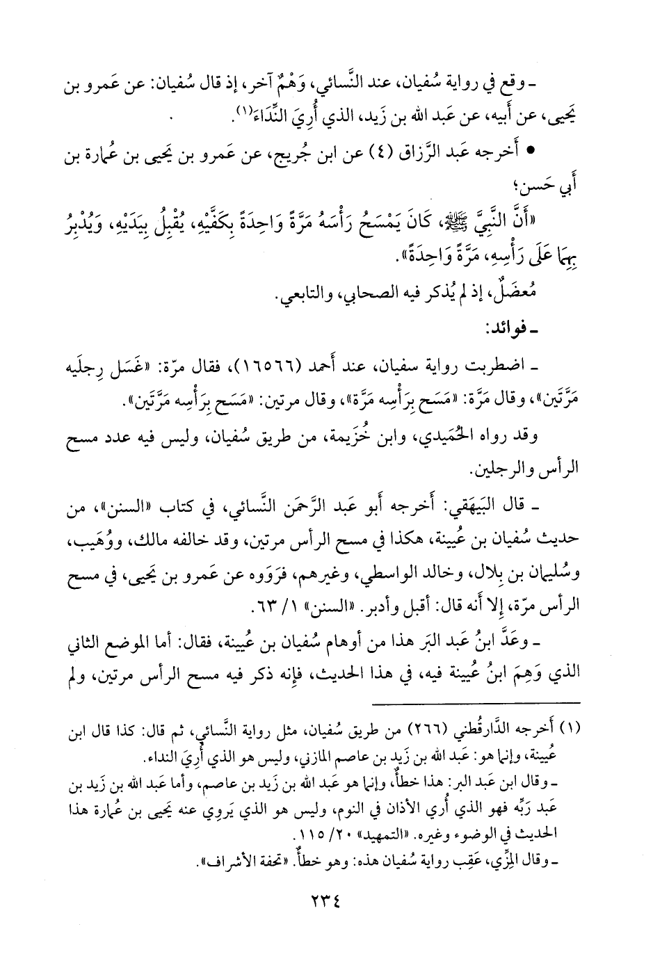 - وعد ابن عبد البَر هذا من أوهام سفيان بن عُيينة، فقال: أما الموضع الثاني الذي وهم ابن عُيينة فيه، في هذا الحديث، فإنه ذكر فيه مسح الرأس مرتين، ولم يذكر فيه أحد «مرتين» غير ابن عُيينة، وأظنه، والله أعلم، تأول الحديث، قوله: «فمسح رأسه بيديه، فأقبل بهما وأدبر»، وما ذكرناه عن ابن عُيينة، فمن رواية مُسدد، ومحمد بن منصور، وأَبي بكر بن أبي شيبة، كلهم ذكر فيه، عن ابن عُيينة ما حكينا عنه، يعني مسح الرأس مرتين،