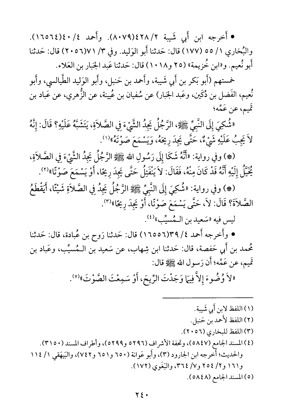 خمستهم (أَبو بكر بن أبي شيبة، وأحمد بن حنبل، وأَبو الوليد الطيالسي، وأَبو نُعيم الفضل بن دُكَين، وعبد الجبار) عن سفيان بن عُيينة، عن الزُّهْري، عن عباد بن تميم، عن عمه؛