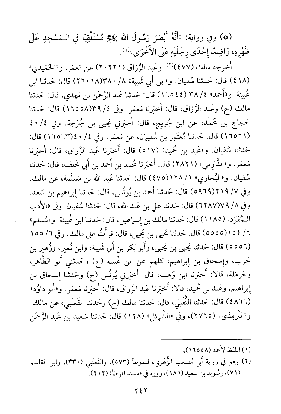 وفي ٤/ ٤٠ (١٦٥٦٣) قال: حدثنا سفيان. و «عَبد بن حُميد» (٥١٧) قال: أخبرنا عبد الرزاق، قال: أخبرنا مَعمَر. و «الدَّارِمي» (٢٨٢١) قال: أخبرنا محمد بن أحمد بن أبي خلف، قال: حدثنا سفيان. و «البخاري» ١/ ١٠٢ (٤٧٥) قال: حدثنا عبد الله بن مَسلَمة، عن مالك. وفي ٧/ ١٧٠ (٥٩٦٩) قال: حدثنا أحمد بن يونس، قال: حدثنا إبراهيم بن سعد. وفي ٨/ ٦٤ (٦٢٨٧) قال: حدثنا علي بن عبد الله، قال: حدثنا سفيان. وفي «الأدب المفرد» (١١٨٥) قال: حدثنا مالك بن إسماعيل، قال: حدثنا ابن عُيينة. و «مسلم» ٦/ ١٥٤ (٥٥٥٥) قال: حدثنا يحيى بن يحيى، قال: قرأت على مالك. وفي ٦/ ١٥٥ (٥٥٥٦) قال: حدثنا يحيى بن يحيى، وأَبو بكر بن أبي شيبة، وابن نُمير، وزهير بن حرب، وإسحاق بن إبراهيم، كلهم عن ابن عُيينة (ح) وحدثني أَبو الطاهر، وحَرملة، قالا: أخبرنا ابن وهب، قال: أخبرني يونس (ح) وحدثنا إسحاق بن إبراهيم، وعَبد بن حُميد، قالا: أخبرنا عبد الرزاق، قال: أخبرنا مَعمَر. و «أَبو داود» (٤٨٦٦) قال: حدثنا النفيلي، قال: حدثنا مالك (ح) وحدثنا القَعنَبي، عن مالك. و «التِّرمِذي» (٢٧٦٥)، وفي «الشمائل» (١٢٨) قال: حدثنا سعيد بن عبد الرَّحمَن