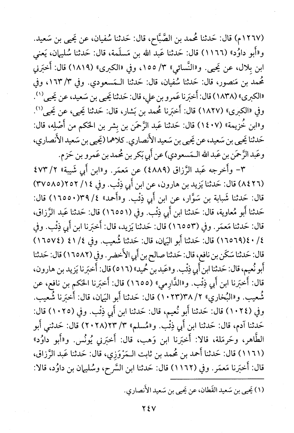 وفي (١٠٢٤) قال: حدثنا أَبو نُعيم، قال: حدثنا ابن أبي ذِئب. وفي (١٠٢٥) قال: حدثنا آدم، قال: حدثنا ابن أبي ذِئب. و «مسلم» ٣/ ٢٣ (٢٠٢٨) قال: حدثني أَبو الطاهر، وحَرملة، قالا: أخبرنا ابن وهب، قال: أخبرني يونس. و «أَبو داود» (١١٦١) قال: حدثنا أحمد بن محمد بن ثابت المَرْوَزي، قال: حدثنا عبد الرزاق، قال: أخبرنا مَعمَر. وفي (١١٦٢) قال: حدثنا ابن السَّرح، وسليمان بن داود، قالا: