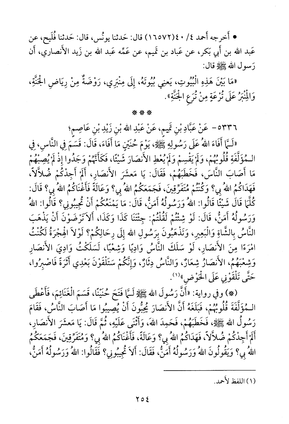 «لما أفاء الله على رسوله صَلى الله عَليه وسَلم يوم حنين ما أفاء، قال: قسم في الناس، في المؤلفة قلوبهم، ولم يقسم ولم يعط الأنصار شيئا، فكأنهم وجدوا إذ لم يصبهم ما أصاب الناس، فخطبهم، فقال: يا معشر الأنصار، ألم أجدكم ضلالا، فهداكم الله بي؟ وكنتم متفرقين، فجمعكم الله بي؟ وعالة فأغناكم الله بي؟ قال: كلما قال شيئًا قالوا: الله ورسوله أمن، قال: ما يمنعكم أن تجيبوني؟ قالوا: الله ورسوله أمن، قال: لو شئتم لقلتم: جئتنا كذا وكذا، ألا ترضون أن يذهب الناس بالشاة والبعير، وتذهبون برسول الله إلى رحالكم؟ لولا الهجرة لكنت امرءا من الأنصار، لو سلك الناس واديا وشعبا، لسلكت وادي الأنصار وشعبهم، الأنصار شعار، والناس دثار، وإنكم ستلقون بعدي أثرة فاصبروا، حتى تلقوني على الحوض» (¬١).
