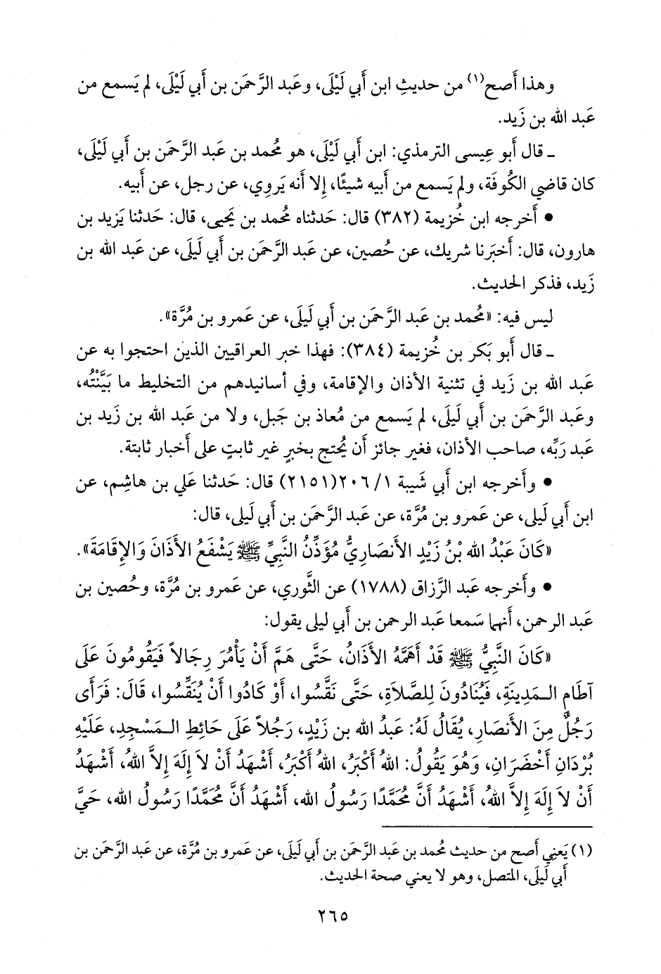 - قال ابن خزيمة (٣٨٤): فهذا خبر العراقيين الذين احتجوا به عن عبد الله بن زيد في تثنية الأذان والإقامة، وفي أسانيدهم من التخليط ما بينته، وعبد الرَّحمَن بن أبي ليلى، لم يسمع من معاذ بن جبل، ولا من عبد الله بن زيد بن عبد رَبِّه، صاحب الأذان، فغير جائز أن يحتج بخبر غير ثابت على أخبار ثابتة.