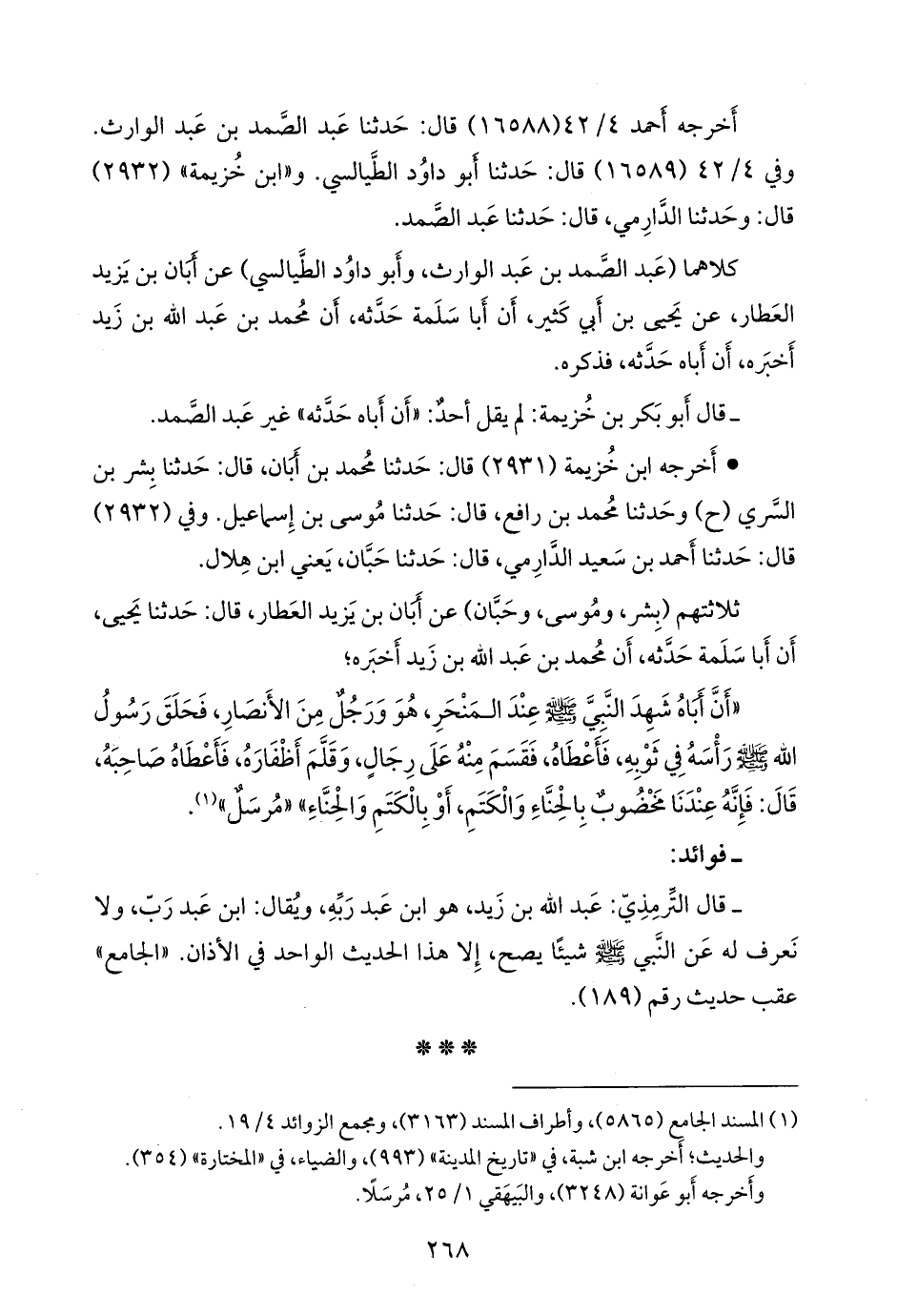 - قال التِّرمِذي: عبد الله بن زيد، هو ابن عبد رَبِّه، ويقال: ابن عبد رب، ولا نعرف له عن النبي صَلى الله عَليه وسَلم شيئًا يصح، إلا هذا الحديث الواحد في الأذان. «السنن» عقب حديث رقم (١٨٩).