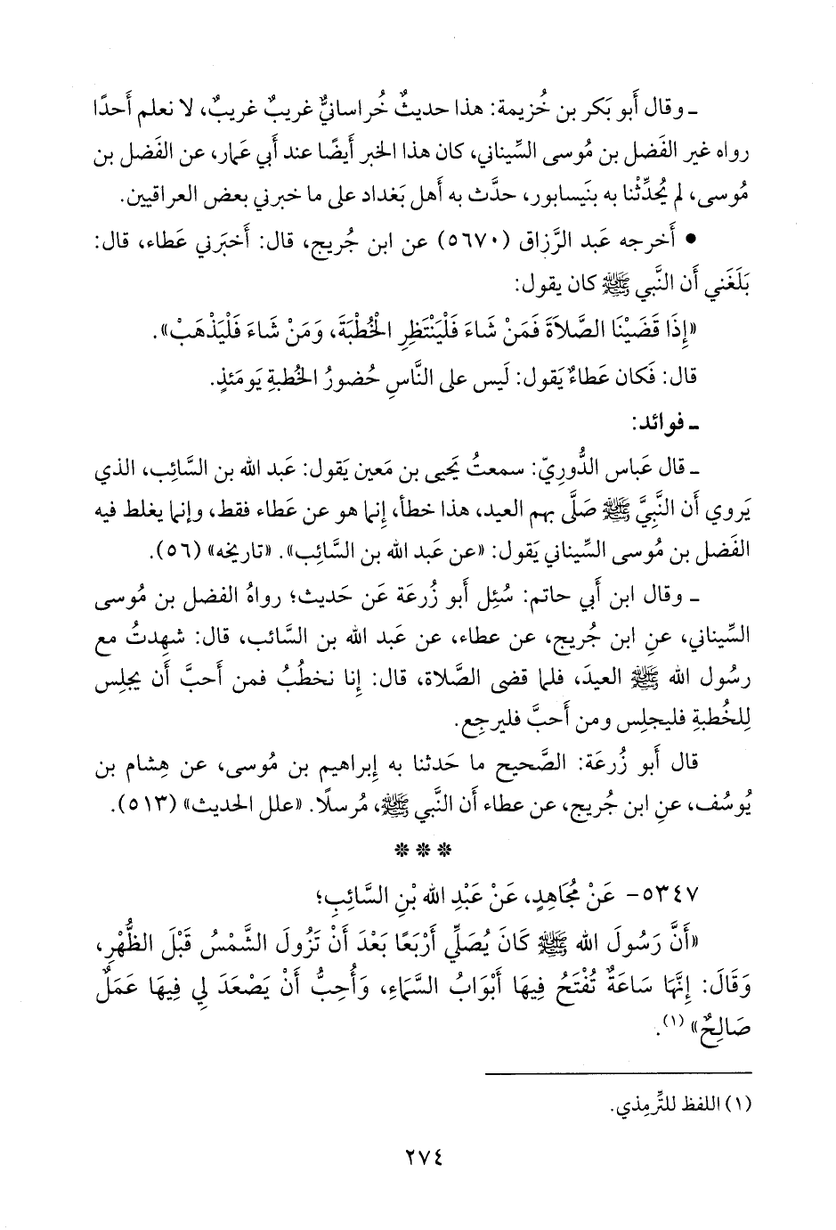 - وقال ابن أبي حاتم: سئل أَبو زُرعَة عن حديث؛ رواه الفضل بن موسى السيناني، عن ابن جُريج، عن عطاء، عن عبد الله بن السائب، قال: شهدت مع رسول الله صَلى الله عَليه وسَلم العيد، فلما قضى الصلاة، قال: إنا نخطب، فمن أحب أن يجلس للخطبة فليجلس ومن أحب فليرجع.