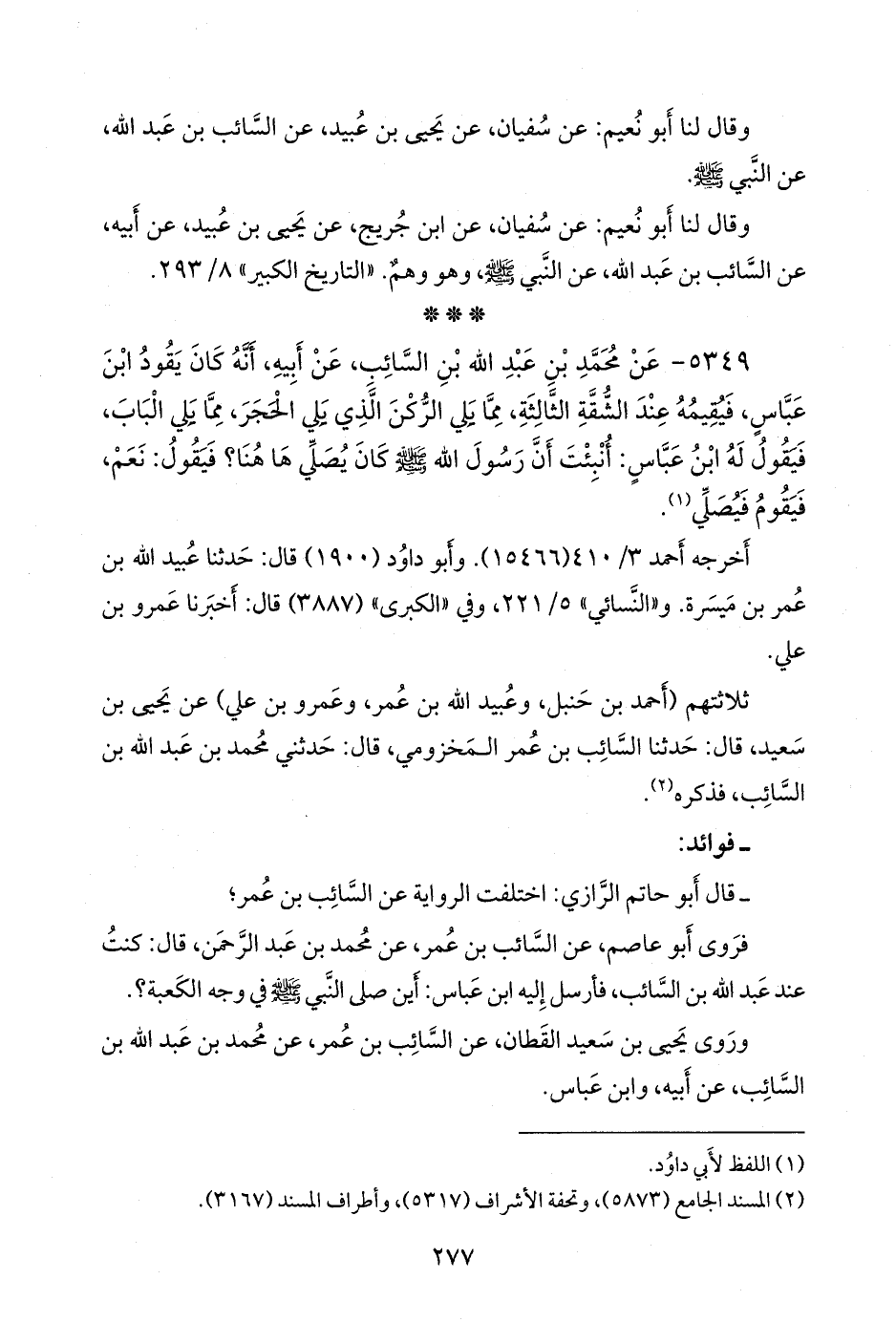 ٥٣٤٩ - عن محمد بن عبد الله بن السائب, عن أبيه, أنه كان يقود ابن عباس, فيقيمه عند الشقة الثالثة، مما يلي الركن الذي يلي الحجر، مما يلي الباب, فيقول له ابن عباس: أنبئت أن رسول الله صَلى الله عَليه وسَلم كان يصلي هاهنا؟ فيقول: نعم, فيقوم فيصلي (¬١).