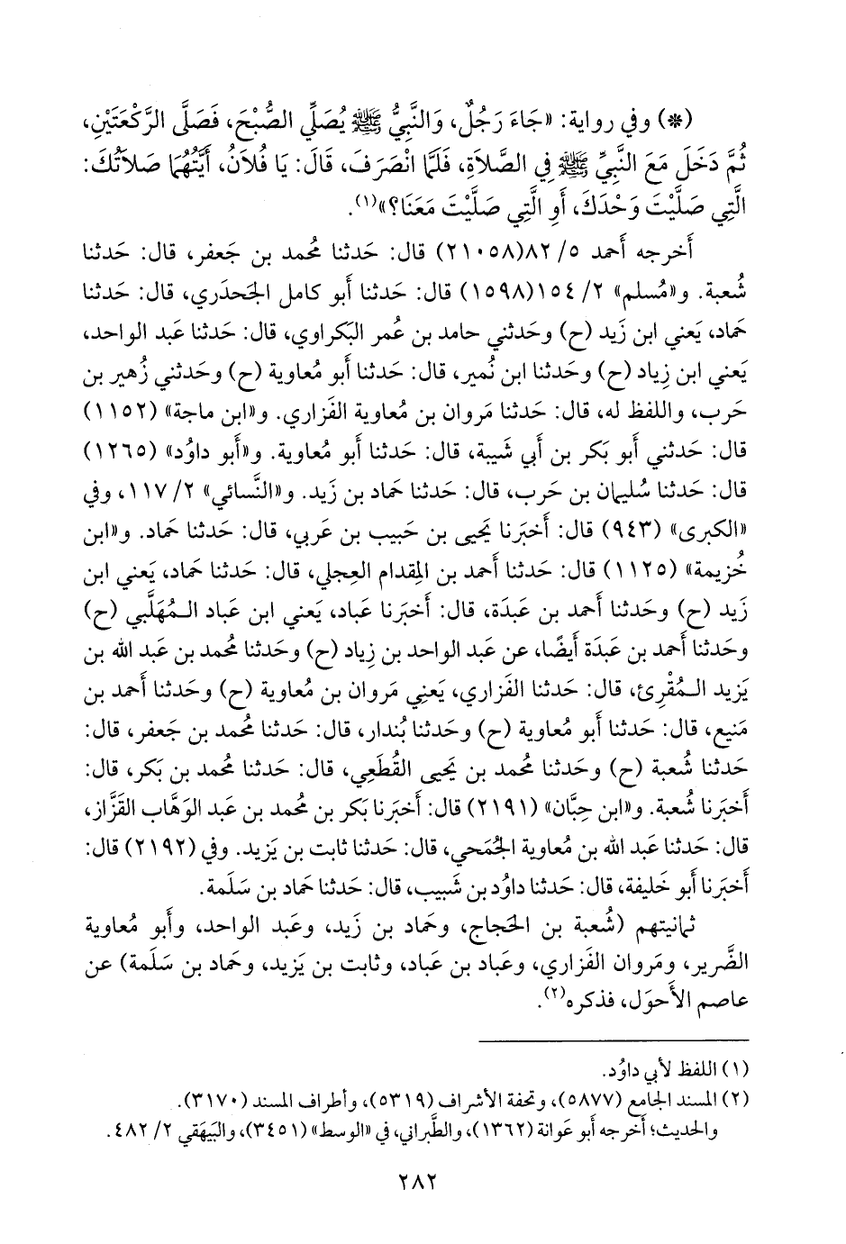 و «أَبو داود» (١٢٦٥) قال: حدثنا سليمان بن حرب، قال: حدثنا حماد بن زيد. و «النَّسَائي» ٢/ ١١٧، وفي «الكبرى» (٩٤٣) قال: أخبرنا يحيى بن حبيب بن عربي، قال: حدثنا حماد. و «ابن خزيمة» (١١٢٥) قال: حدثنا أحمد بن المقدام العجلي, قال: حدثنا حماد، يعني ابن زيد (ح) وحدثنا أحمد بن عَبدة، قال: أخبرنا عباد، يعني ابن عباد المهلبي (ح) وحدثنا أحمد بن عَبدة أيضا، عن عبد الواحد بن زياد (ح) وحدثنا محمد بن عبد الله بن يزيد المُقرِئ، قال: حدثنا الفزاري، يعني مروان بن معاوية (ح) وحدثنا أحمد بن مَنيع، قال: حدثنا أَبو معاوية (ح) وحدثنا بندار, قال: حدثنا محمد بن جعفر، قال: حدثنا شعبة (ح) وحدثنا محمد بن يحيى القطعي، قال: حدثنا محمد بن بكر، قال: أخبرنا شعبة. و «ابن حِبَّان» (٢١٩١) قال: أخبرنا بكر بن محمد بن عبد الوَهَّاب القزاز، قال: حدثنا عبد الله بن معاوية الجُمحي، قال: حدثنا ثابت بن يزيد. وفي (٢١٩٢) قال: أخبرنا أَبو خليفة، قال: حدثنا داود بن شبيب، قال: حدثنا حماد بن سلمة.