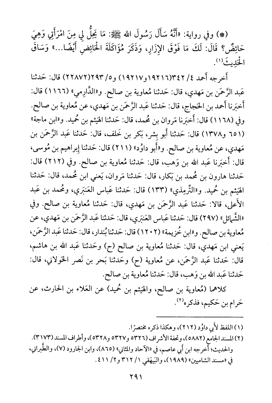 أخرجه أحمد (١٩٢١٦ و ١٩٢١٧) و ٥/ ٢٩٣ (٢٢٨٧٢) قال: حدثنا عبد الرَّحمَن بن مهدي، قال: حدثنا معاوية بن صالح. و «الدَّارِمي» (١١٦٦) قال: أخبرنا أحمد بن الحجاج، قال: حدثنا عبد الرَّحمَن بن مهدي، عن معاوية بن صالح. وفي (١١٦٨) قال: أخبرنا مروان بن محمد، قال: حدثنا الهيثم بن حميد. و «ابن ماجة» (٦٥١ و ١٣٧٨) قال: حدثنا أَبو بشر، بكر بن خلف، قال: حدثنا عبد الرَّحمَن بن مهدي، عن معاوية بن صالح. و «أَبو داود» (٢١١) قال: حدثنا إبراهيم بن موسى، قال: أخبرنا عبد الله بن وهب، قال: حدثنا معاوية بن صالح. وفي (٢١٢) قال: حدثنا هارون بن محمد بن بكار، قال: حدثنا مروان، يعني ابن محمد، قال: حدثنا الهيثم بن حميد. و «التِّرمِذي» (١٣٣) قال: حدثنا عباس العنبري، ومحمد بن عبد الأعلى، قالا: حدثنا عبد الرَّحمَن بن مهدي، قال: حدثنا معاوية بن صالح. وفي «الشمائل» (٢٩٧) قال: حدثنا عباس العنبري، قال: حدثنا عبد الرَّحمَن بن مهدي، عن معاوية بن صالح. و «ابن خزيمة» (١٢٠٢) قال: حدثنا بندار, قال: حدثنا عبد الرَّحمَن، يعني ابن مهدي، قال: حدثنا معاوية بن صالح (ح) وحدثنا عبد الله بن هاشم، قال: حدثنا عبد الرَّحمَن، عن معاوية (ح) وحدثنا بحر بن نصر الخَولاني، قال: حدثنا عبد الله بن وهب، قال: حدثنا معاوية بن صالح.