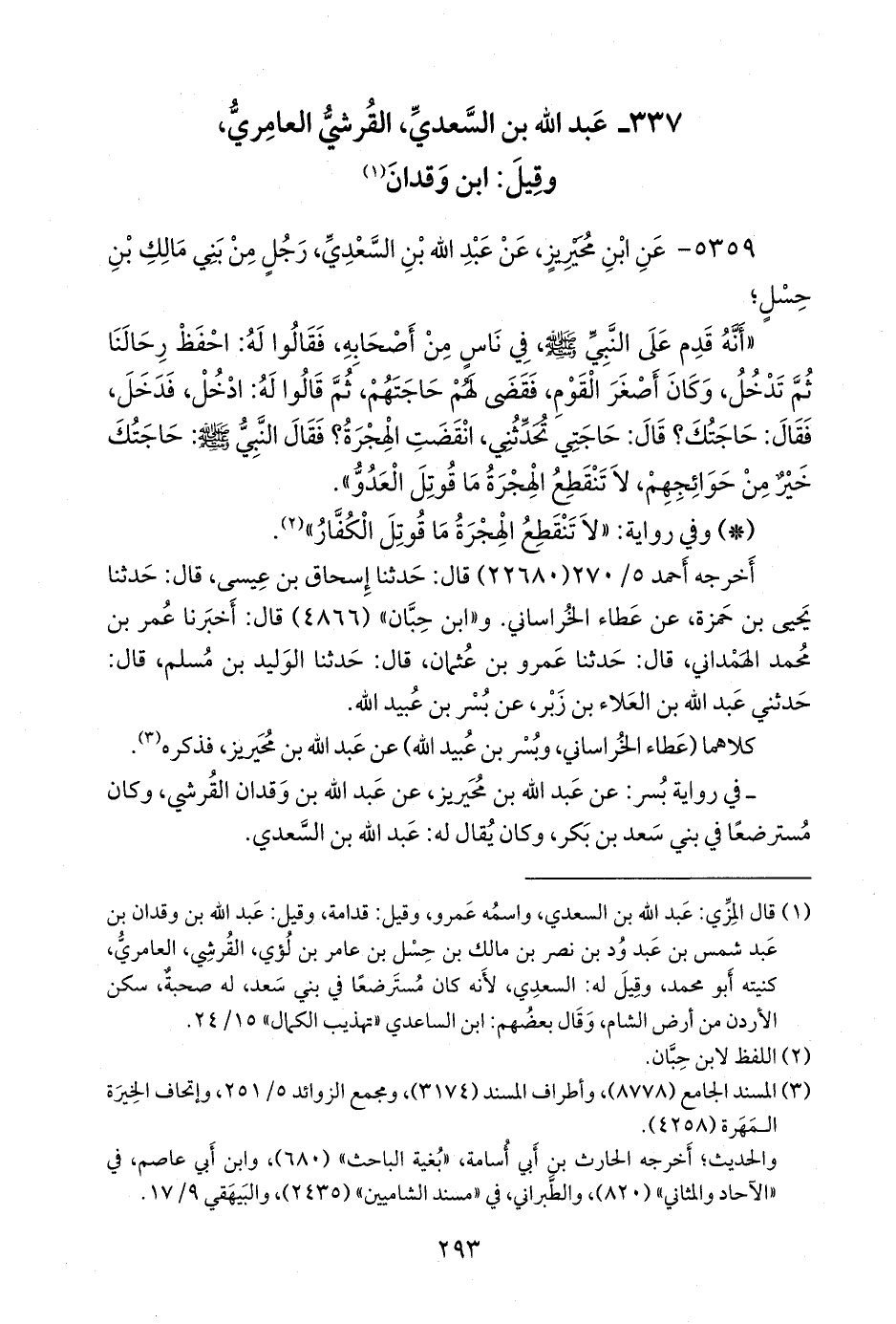(¬١) قال المِزِّي: عبد الله بن السعدي، واسمه عَمرو، وقيل: قدامة، وقيل: عبد الله بن وقدان بن عبد شمس بن عبد ود بن نصر بن مالك بن حسل بن عامر بن لؤي، القرشي، العامري، كنيته أَبو محمد، وقيل له: السعدي، لأنه كان مسترضعا في بني سعد، له صحبة، سكن الأردن من أرض الشام، وقال بعضهم: ابن الساعدي. «تهذيب الكمال» ١٥/ ٢٤.