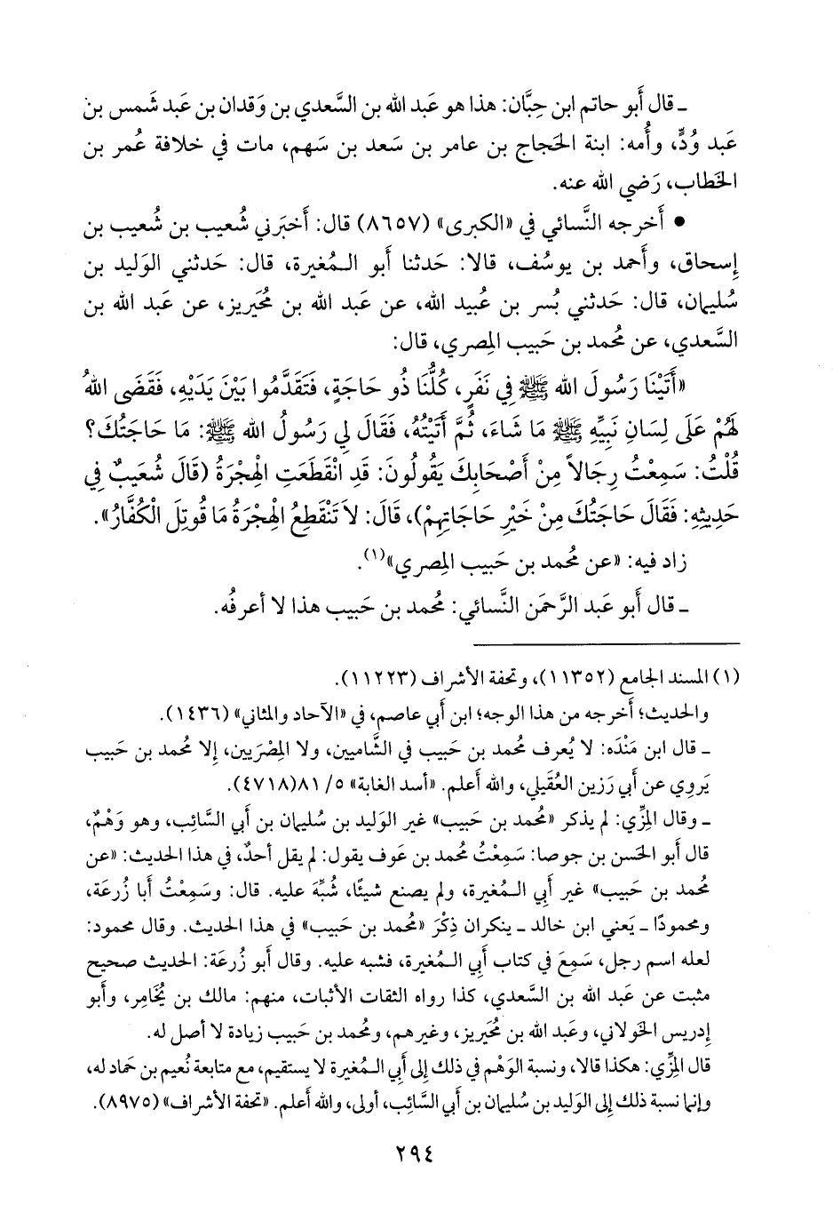 - وقال المِزِّي: لم يذكر «محمد بن حبيب» غير الوليد بن سليمان بن أبي السائب، وهو وهم، قال أَبو الحسن بن جوصا: سمعت محمد بن عوف يقول: لم يقل أحد، في هذا الحديث: «عن محمد بن حبيب» غير أبي المغيرة، ولم يصنع شيئا، شبه عليه. قال: وسمعت أَبا زُرعَة، ومحمودا، يعني ابن خالد ـ ينكران ذكر «محمد بن حبيب» في هذا الحديث. وقال محمود: لعله اسم رجل، سمع في كتاب أبي المغيرة، فشبه عليه. وقال أَبو زُرعَة: الحديث صحيح مثبت عن عبد الله بن السعدي, كذا رواه الثقات الأثبات, منهم: مالك بن يخامر, وأَبو إدريس الخَولاني, وعبد الله بن محيريز, وغيرهم, ومحمد بن حبيب زيادة لا أصل له.