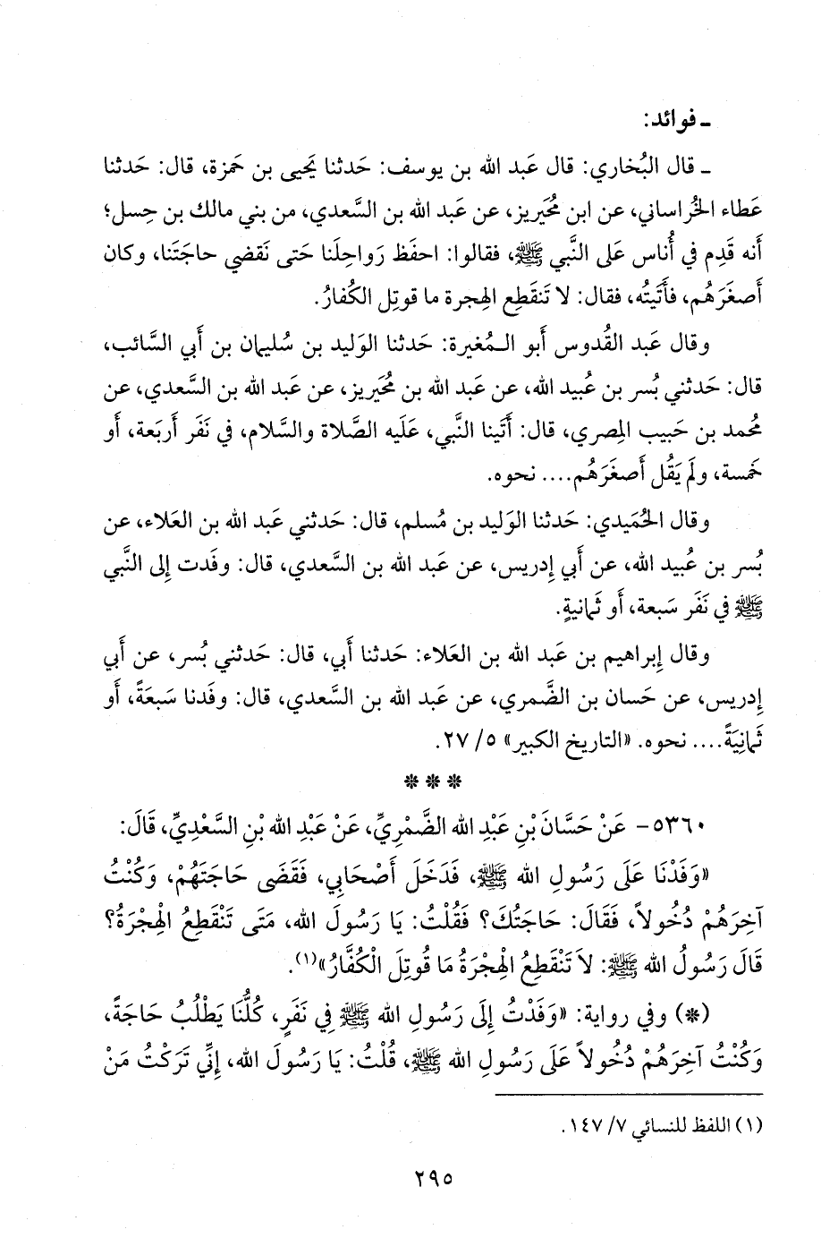 - قال البخاري: قال عبد الله بن يوسف: حدثنا يحيى بن حمزة، قال: حدثنا عطاء الخراساني، عن ابن محيريز، عن عبد الله بن السعدي، من بني مالك بن حسل؛ أنه قدم في أناس على النبي صَلى الله عَليه وسَلم فقالوا: احفظ رواحلنا حتى نقضي حاجتنا، وكان أصغرهم، فأتيته، فقال: لا تنقطع الهجرة ما قوتل الكفار.