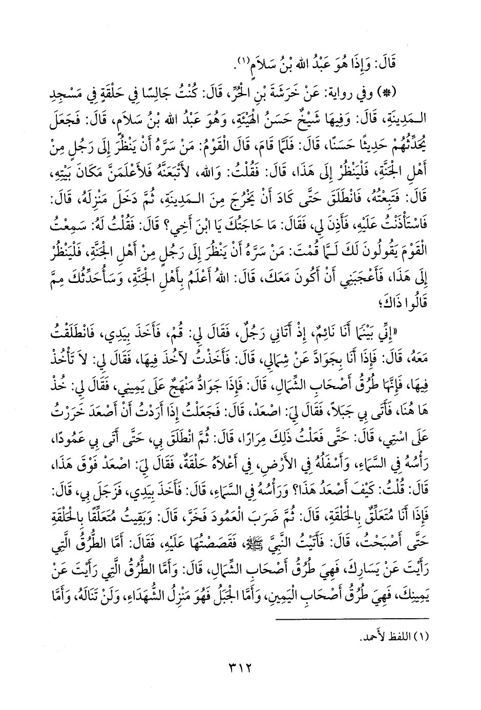 - وفي رواية: عن خرشة بن الحر, قال: كنت جالسا في حلقة في مسجد المدينة, قال: وفيها شيخ حسن الهيئة, وهو عبد الله بن سلام, قال: فجعل يحدثهم حديثا حسنا, قال: فلما قام, قال القوم: من سره أن ينظر إلى رجل من أهل الجنة، فلينظر إلى هذا, قال: فقلت: والله، لأتبعنه فلأعلمن مكان بيته, قال: فتبعته, فانطلق حتى كاد أن يخرج من المدينة, ثم دخل منزله, قال: فاستأذنت عليه, فأذن لي, فقال: ما حاجتك يا ابن أخي؟ قال: فقلت له: سمعت القوم يقولون لك لما قمت: من سره أن ينظر إلى رجل من أهل الجنة، فلينظر إلى هذا, فأعجبني أن أكون معك, قال: الله أعلم بأهل الجنة, وسأحدثك مم قالوا ذاك؛