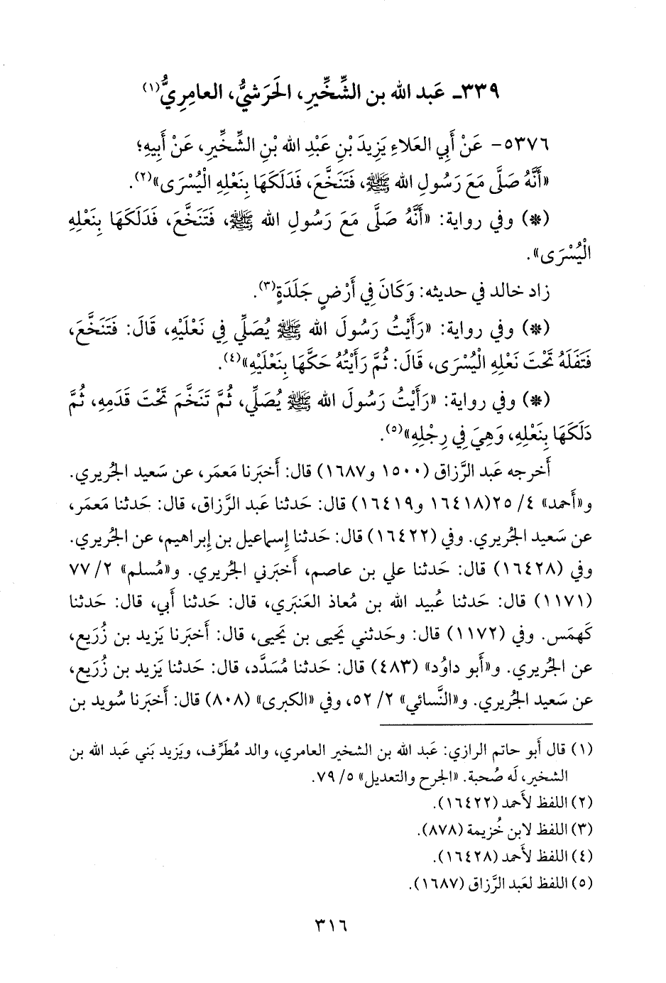 أخرجه عبد الرزاق (١٥٠٠ و ١٦٨٧) قال: أخبرنا معمر، عن سعيد الجُريري. و «أحمد» ٤/ ٢٥ (١٦٤١٨ و ١٦٤١٩) قال: حدثنا عبد الرزاق، قال: حدثنا مَعمَر، عن سعيد الجُريري. وفي (١٦٤٢٢) قال: حدثنا إسماعيل بن إبراهيم، عن الجُريري. وفي (١٦٤٢٨) قال: حدثنا علي بن عاصم, أخبرني الجُريري. و «مسلم» ٢/ ٧٧ (١١٧١) قال: حدثنا عُبيد الله بن معاذ العنبري، قال: حدثنا أبي، قال: حدثنا كهمس. وفي (١١٧٢) قال: وحدثني يحيى بن يحيى، قال: أخبرنا يزيد بن زُريع، عن الجُريري. و «أَبو داود» (٤٨٣) قال: حدثنا مُسدد, قال: حدثنا يزيد بن زُريع، عن سعيد الجُريري. و «النَّسَائي» ٢/ ٥٢، وفي «الكبرى» (٨٠٨) قال: أخبرنا سويد بن