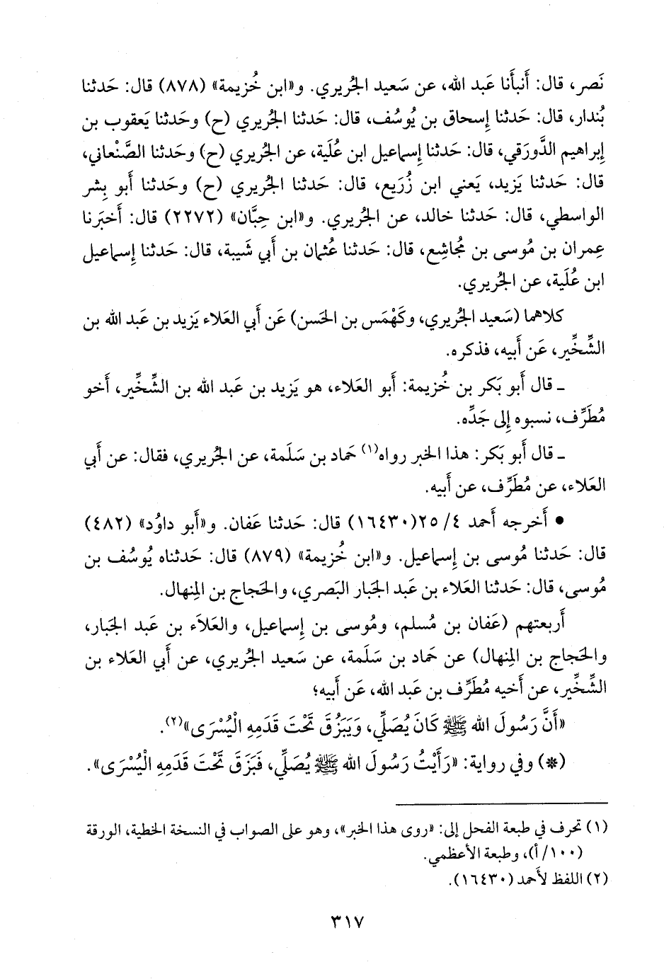 أربعتهم (عفان بن مسلم، وموسى بن إسماعيل، والعلاء بن عبد الجبار، والحجاج بن المنهال) عن حماد بن سلمة، عن سعيد الجُريري، عن أبي العلاء بن الشخير، عن أخيه مطرف بن عبد الله، عن أبيه؛