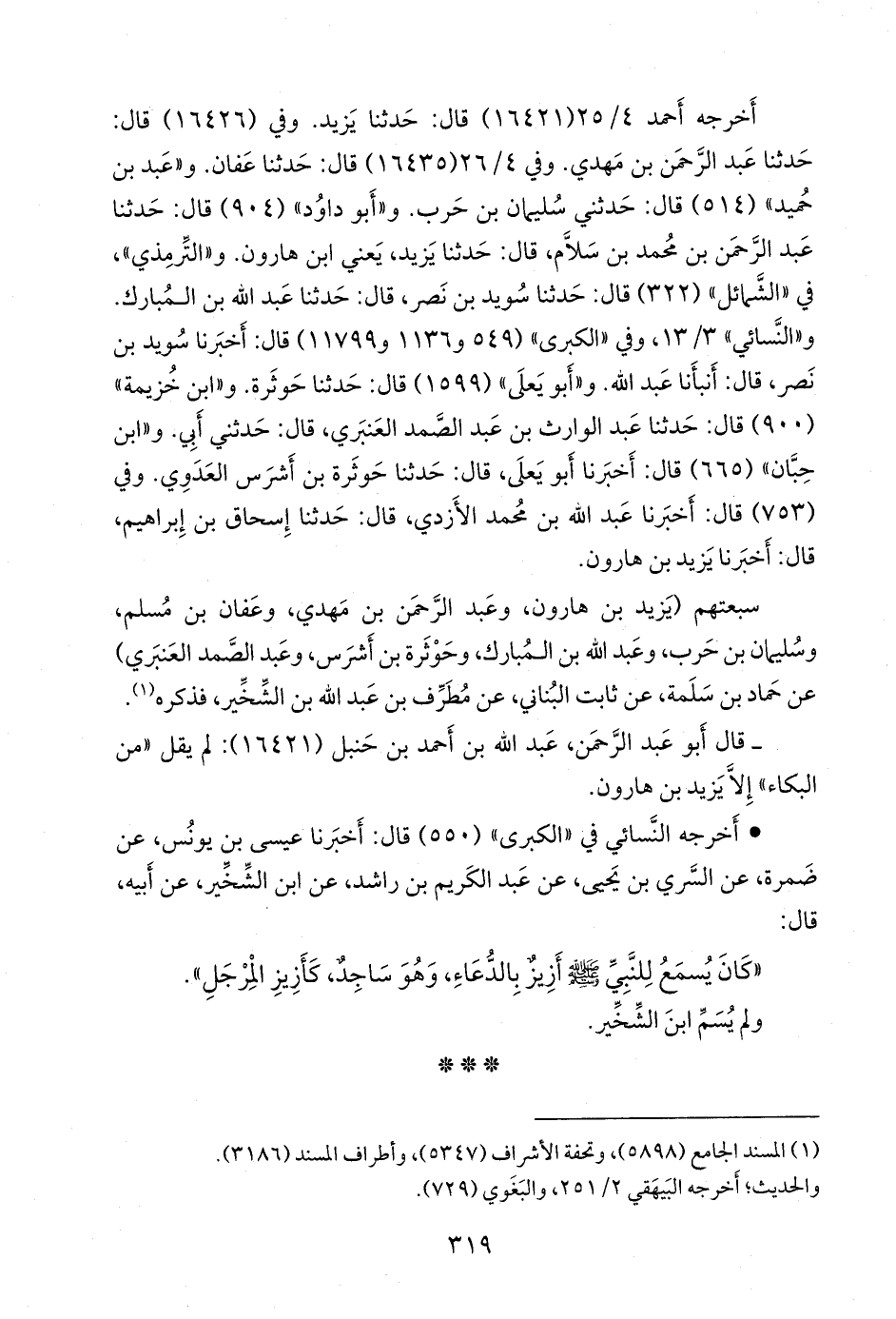 سبعتهم (يزيد بن هارون, وعبد الرَّحمَن بن مهدي، وعفان بن مسلم، وسليمان بن حرب، وعبد الله بن المبارك، وحوثرة بن أشرس، وعبد الصمد العنبري) عن حماد بن سلمة، عن ثابت البُنَاني، عن مطرف بن عبد الله بن الشخير، فذكره (¬١).