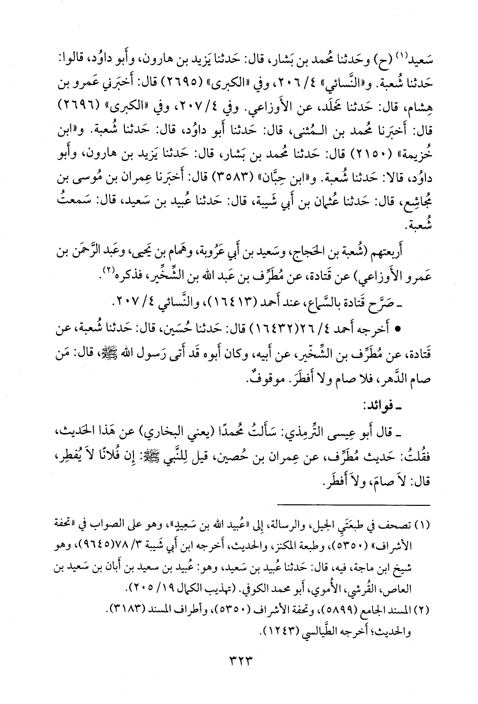 - قال التِّرمِذي: سألتُ محمدًا، يعني ابن إسماعيل البخاري، عن هذا الحديث، فقلت: حديث مطرف، عن عمران بن حصين، قيل للنبي صَلى الله عَليه وسَلم: إن فلانا لا يفطر، قال: لا صام، ولا أفطر.