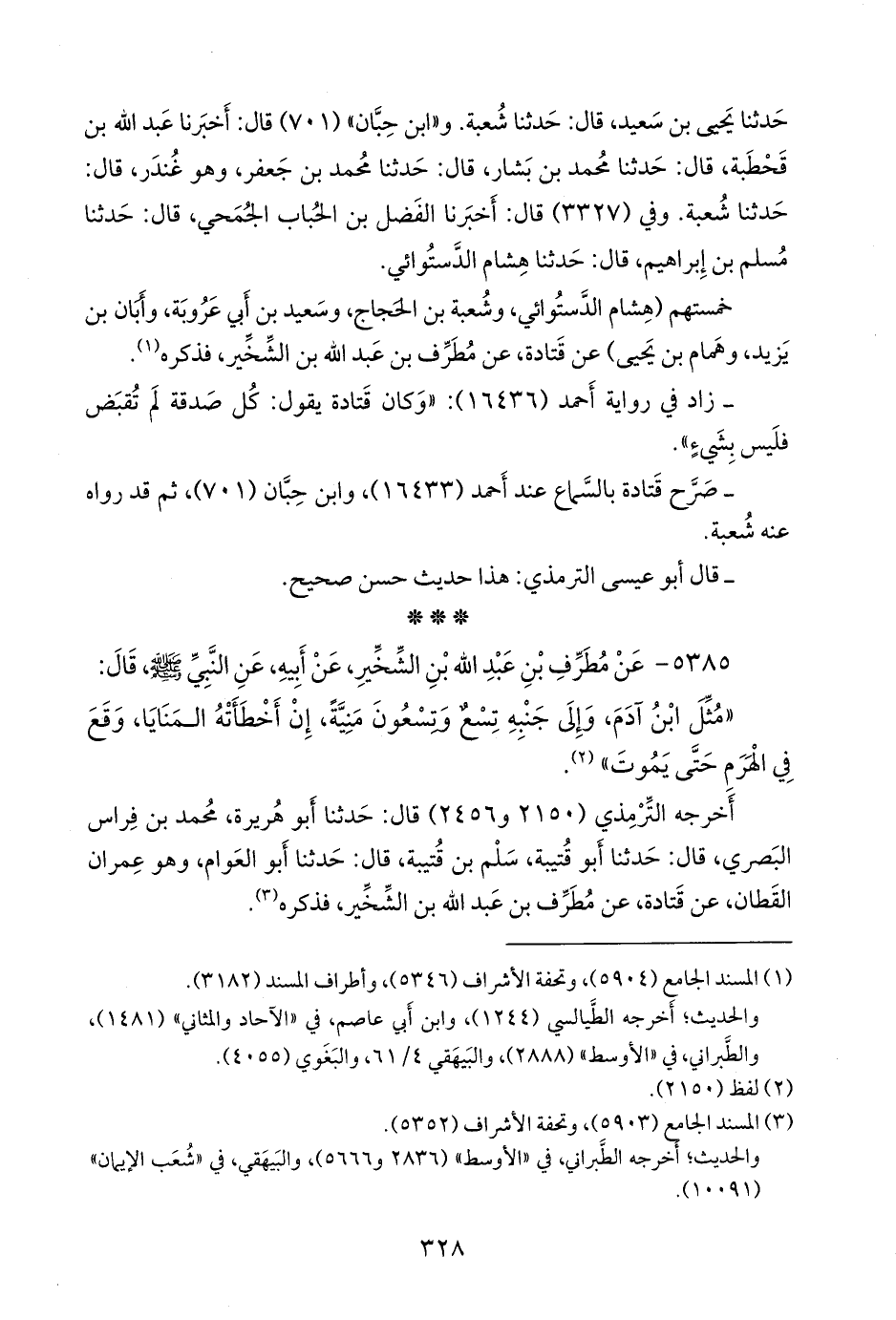 خمستهم (هشام الدَّستوائي، وشعبة بن الحجاج، وسعيد بن أبي عَروبَة، وأبان بن يزيد، وهمام بن يحيى) عن قتادة، عن مطرف بن عبد الله بن الشخير، فذكره (¬١).