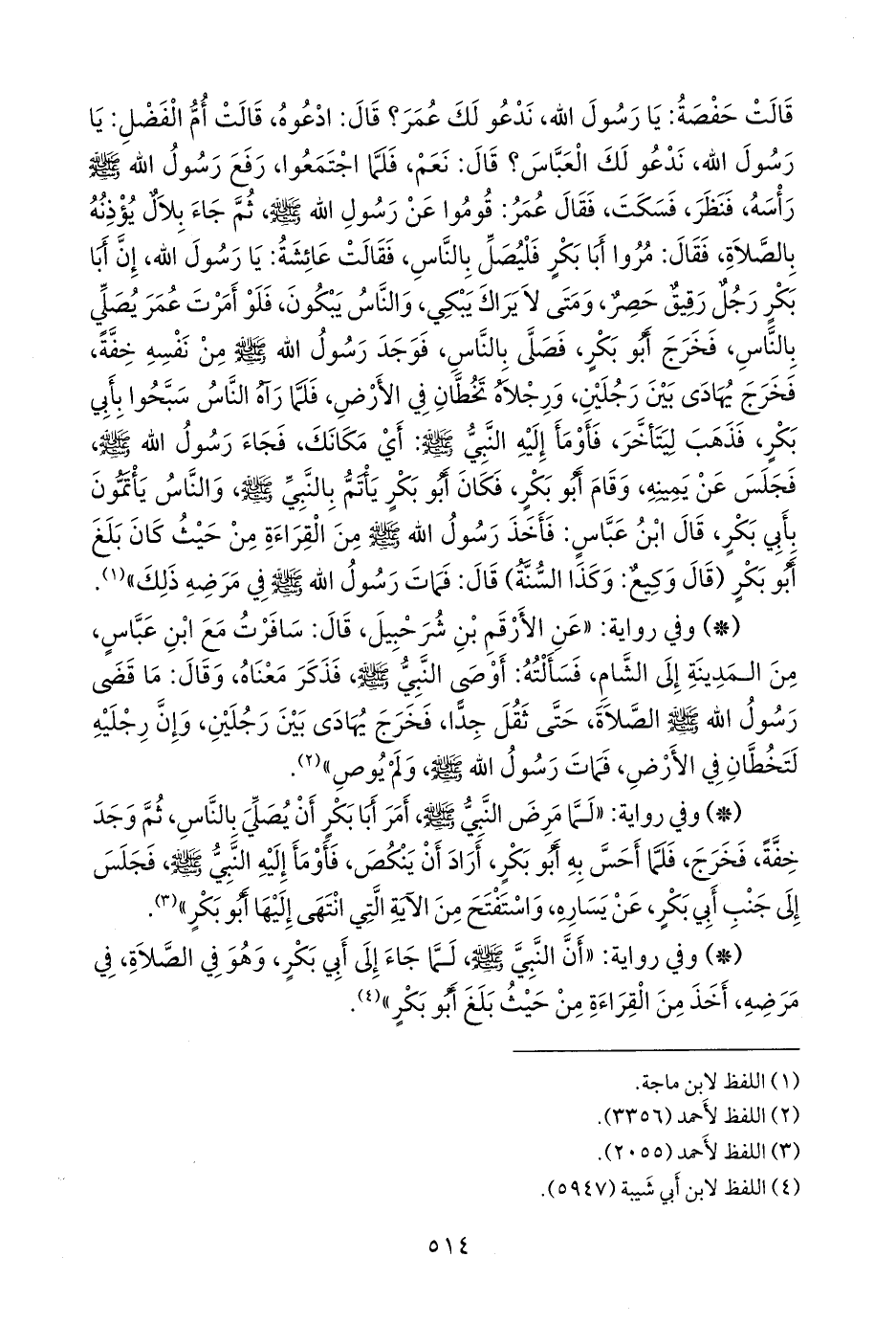 - وفي رواية: «عن الأرقم بن شرحبيل، قال: سافرت مع ابن عباس، من المدينة إلى الشام، فسألته: أوصى النبي صَلى الله عَليه وسَلم فذكر معناه، وقال: ما قضى رسول الله صَلى الله عَليه وسَلم الصلاة، حتى ثقل جدا، فخرج يهادى بين رجلين، وإن رجليه لتخطان في الأرض، فمات رسول الله صَلى الله عَليه وسَلم ولم يوص» (¬١).