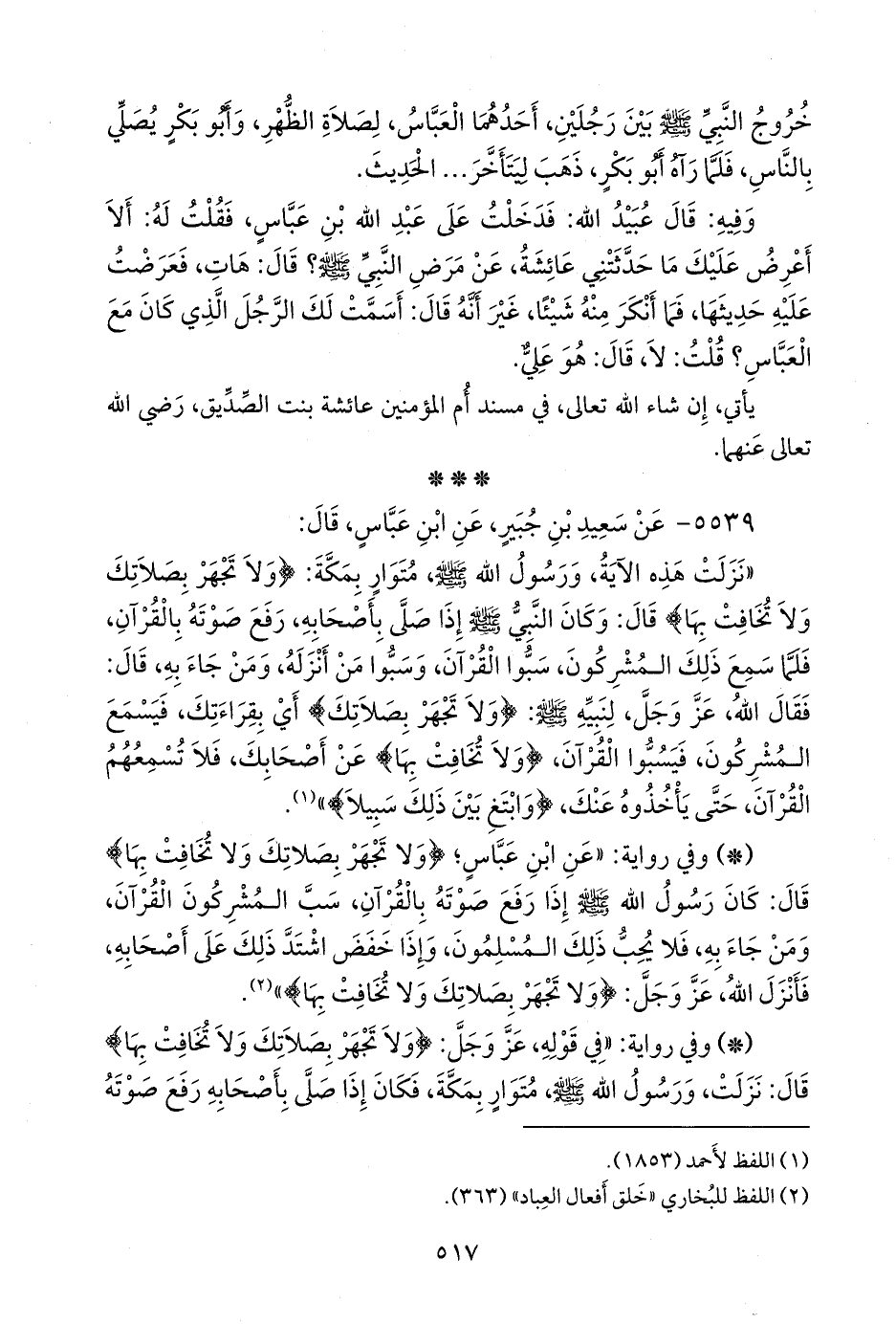 - وفي رواية: «عن ابن عباس؛ {ولا تجهر بصلاتك ولا تخافت بها} قال: كان رسول الله صَلى الله عَليه وسَلم إذا رفع صوته بالقرآن، سب المشركون القرآن، ومن جاء به، فلا يحب ذلك المسلمون، وإذا خفض اشتد ذلك على أصحابه، فأنزل الله، عز وجل: {ولا تجهر بصلاتك ولا تخافت بها}» (¬٢).