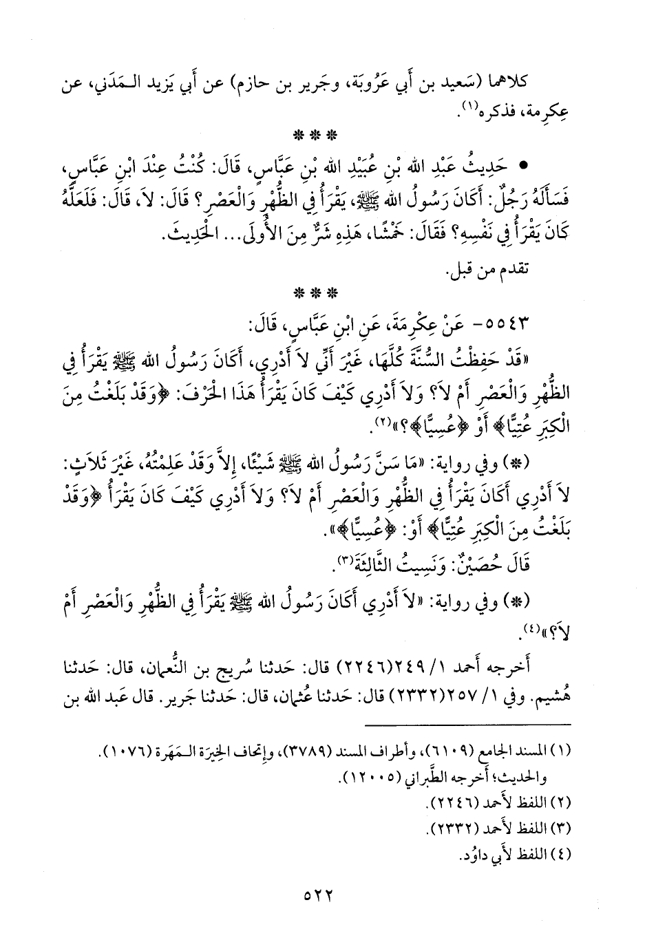 • حديث عبد الله بن عُبيد الله بن عباس، قال: كنت عند ابن عباس، فسأله رجل: أكان رسول الله صَلى الله عَليه وسَلم يقرأ في الظهر والعصر؟ قال: لا، قال: فلعله كان يقرأ في نفسه؟ فقال: خمشا، هذه شر من الأولى، الحديث.