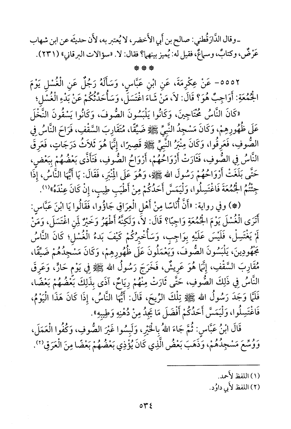 ٥٥٥٢ - عن عِكرمة مولى عبد الله بن عباس، عن عبد الله بن عباس، وسأله رجل عن الغسل يوم الجمعة: أواجب هو؟ قال: لا، من شاء اغتسل، وسأحدثكم عن بدء الغسل؛