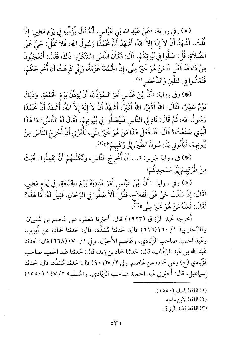 - وفي رواية: «أن ابن عباس أمر مناديه يوم الجمعة، في يوم مطير، فقال: إذا بلغت حي على الفلاح، فقل: ألا صلوا في الرحال، فقيل له: ما هذا؟ فقال: فعله من هو خير مني» (¬١).