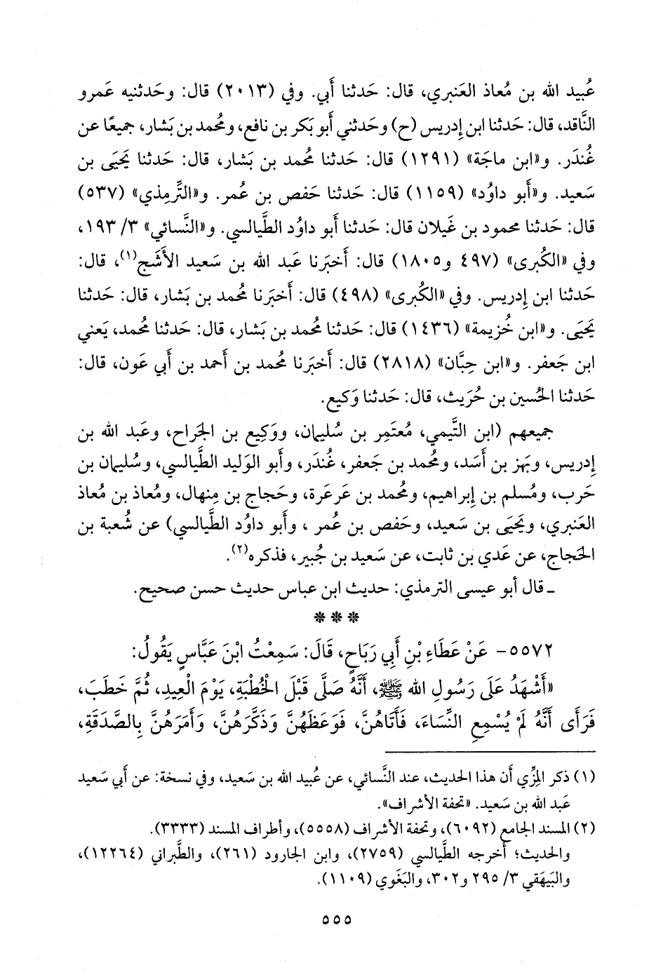 وفي (٢٠١٣) قال: وحدثنيه عَمرو الناقد، قال: حدثنا ابن إدريس (ح) وحدثني أَبو بكر بن نافع، ومحمد بن بشار، جميعا عن غُندَر. و «ابن ماجة» (١٢٩١) قال: حدثنا محمد بن بشار، قال: حدثنا يحيى بن سعيد. و «أَبو داود» (١١٥٩) قال: حدثنا حفص بن عمر. و «التِّرمِذي» (٥٣٧) قال: حدثنا محمود بن غَيلان قال: حدثنا أَبو داود الطيالسي. و «النَّسَائي» ٣/ ١٩٣، وفي «الكبرى» (٤٩٧ و ١٨٠٥) قال: أخبرنا عبد الله بن سعيد الأشج (¬١)، قال: حدثنا ابن إدريس. وفي «الكبرى» (٤٩٨) قال: أخبرنا محمد بن بشار، قال: حدثنا يحيى. و «ابن خزيمة» (١٤٣٦) قال: حدثنا محمد بن بشار، قال: حدثنا محمد، يعني ابن جعفر. و «ابن حِبَّان» (٢٨١٨) قال: أخبرنا محمد بن أحمد بن أبي عون، قال: حدثنا الحسين بن حريث، قال: حدثنا وكيع.