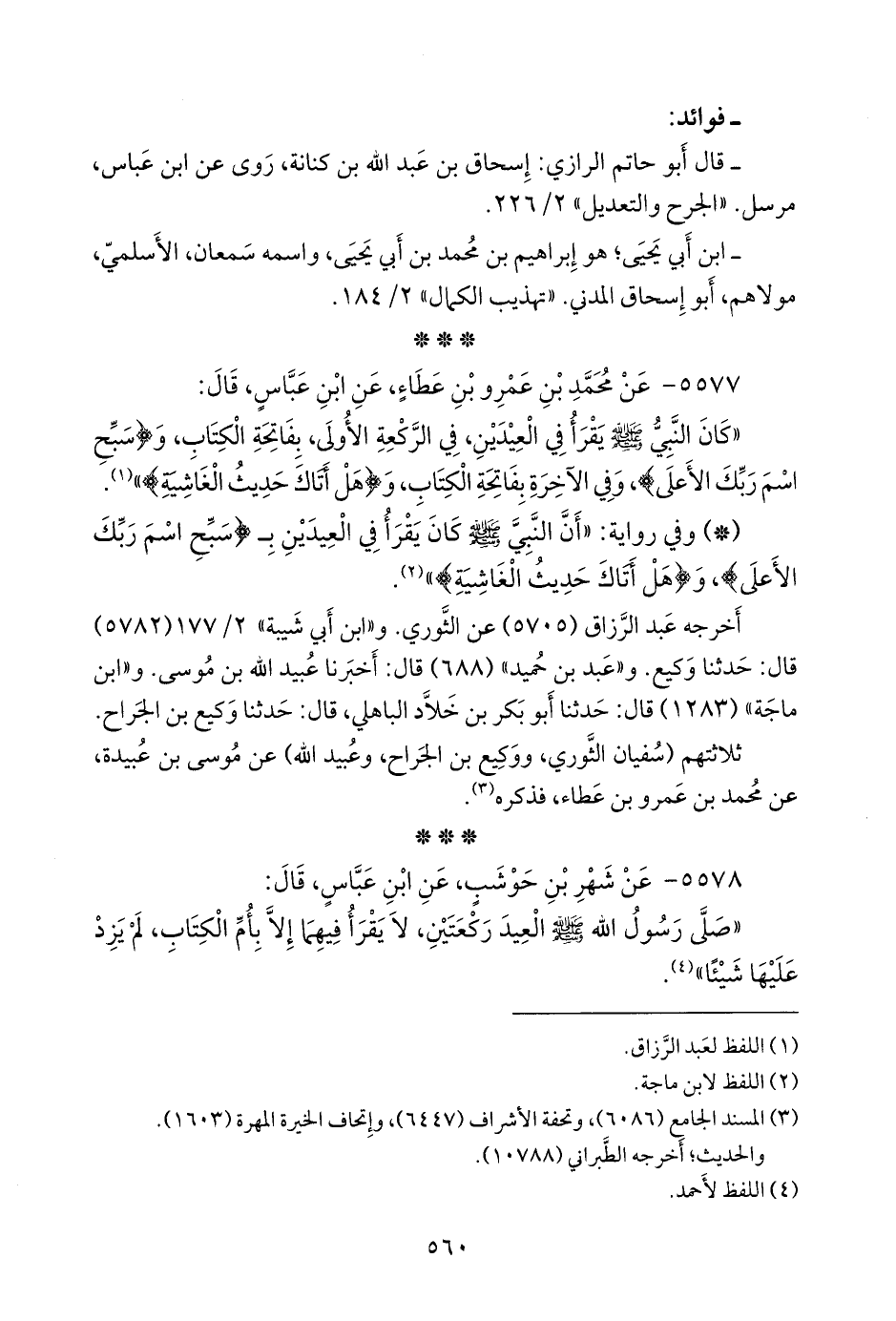 - وفي رواية: «أن النبي صَلى الله عَليه وسَلم كان يقرأ في العيدين بـ: {سَبِّحِ اسْمَ رَبِّكَ الأَعْلَى}، و {هل أتاك حديث الغاشية}» (¬٢).
