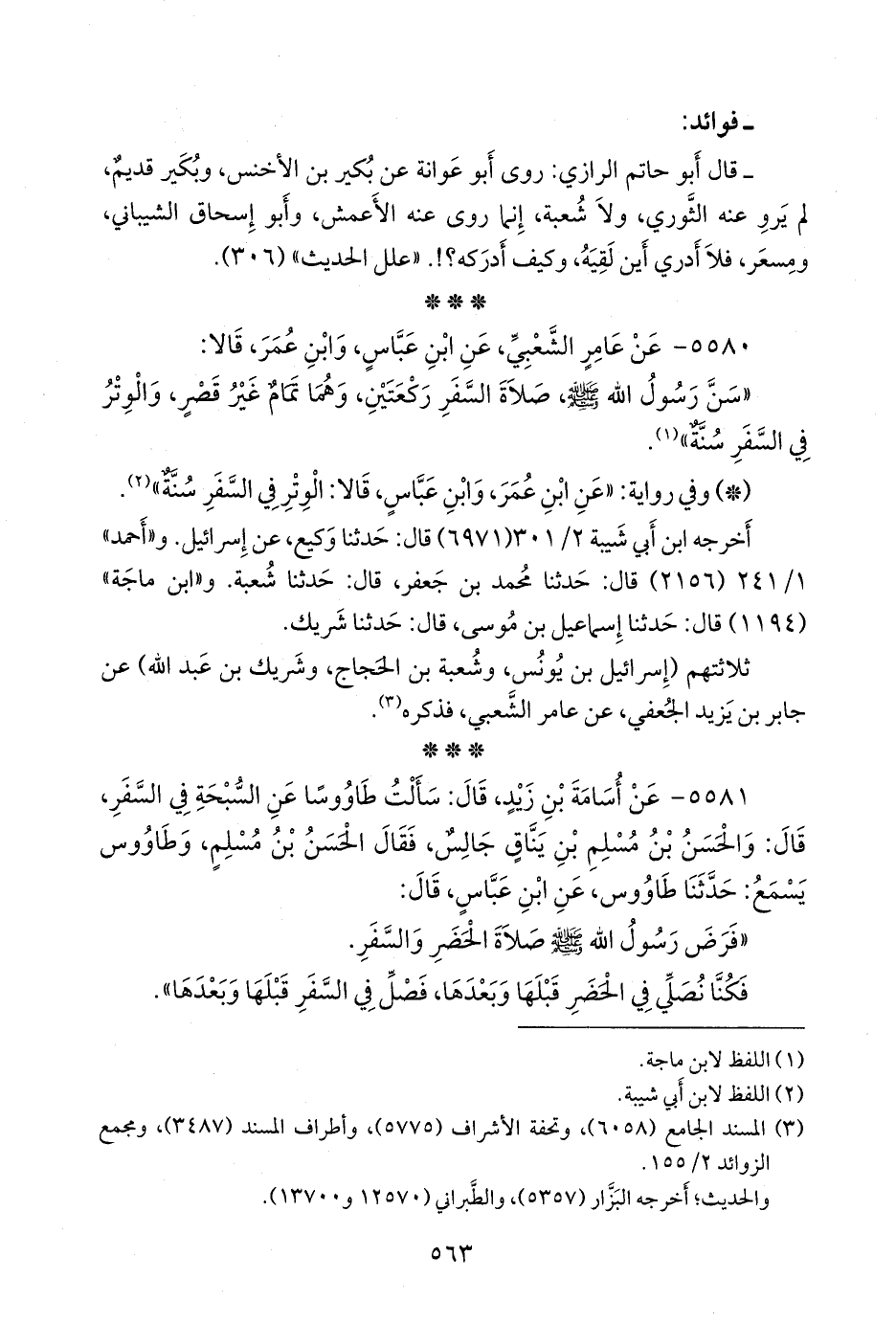 ٥٥٨١ - عن أُسامة بن زيد، قال: سألت طاووسا عن السبحة في السفر، قال: والحسن بن مسلم بن يناق جالس، فقال الحسن بن مسلم، وطاووس يسمع: حدثنا طاووس، عن ابن عباس، قال: