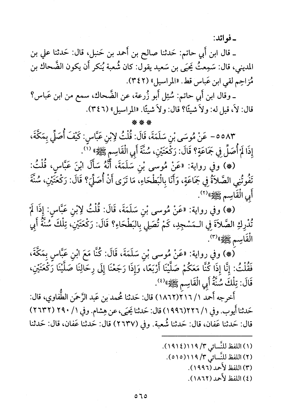 ٥٥٨٣ - عن موسى بن سلمة، قال: قلت لابن عباس: كيف أصلي بمكة، إذا لم أصل في جماعة؟ قال: ركعتين، سنة أبي القاسم صَلى الله عَليه وسَلم» (¬١).