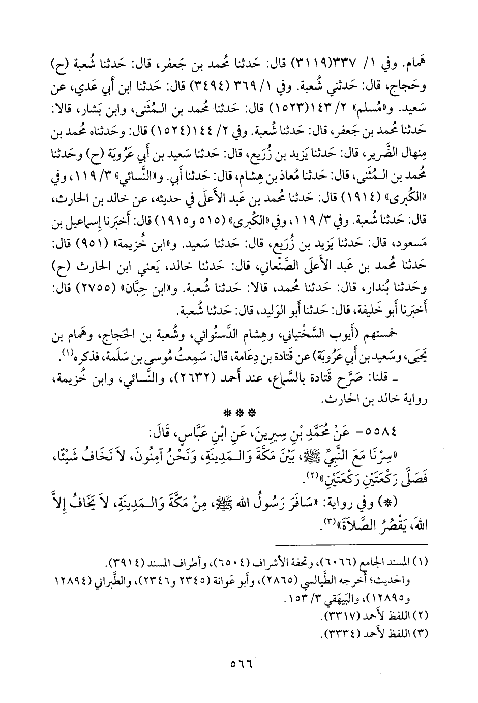 وفي ١/ ٣٦٩ (٣٤٩٤) قال: حدثنا ابن أَبي عَدي، عن سعيد. و «مسلم» ٢/ ١٤٣ (١٥٢٣) قال: حدثنا محمد بن المثنى، وابن بشار، قالا: حدثنا محمد بن جعفر، قال: حدثنا شعبة. وفي ٢/ ١٤٤ (١٥٢٤) قال: وحدثناه محمد بن منهال الضرير، قال: حدثنا يزيد بن زُريع، قال: حدثنا سعيد بن أبي عَروبَة (ح) وحدثنا محمد بن المثنى، قال: حدثنا معاذ بن هشام، قال: حدثنا أبي. و «النَّسَائي» ٣/ ١١٩، وفي «الكبرى» (١٩١٤) قال: حدثنا محمد بن عبد الأعلى في حديثه، عن خالد بن الحارث، قال: حدثنا شعبة. وفي ٣/ ١١٩، وفي «الكبرى» (٥١٥ و ١٩١٥) قال: أخبرنا إسماعيل بن مسعود، قال: حدثنا يزيد بن زُريع، قال: حدثنا سعيد. و «ابن خزيمة» (٩٥١) قال: حدثنا محمد بن عبد الأعلى الصَّنْعاني، قال: حدثنا خالد، يعني ابن الحارث (ح) وحدثنا بُندَار، قال: حدثنا محمد، قالا: حدثنا شعبة. و «ابن حِبَّان» (٢٧٥٥) قال: أخبرنا أَبو خليفة، قال: حدثنا أَبو الوليد، قال: حدثنا شعبة.