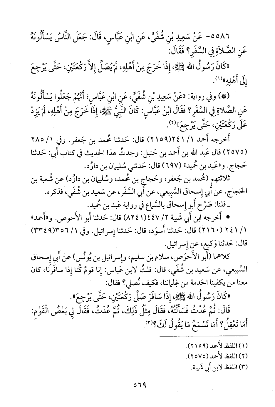 ٥٥٨٦ - عن سعيد بن شفي، عن ابن عباس، قال: جعل الناس يسألونه عن الصلاة في السفر؟ فقال: