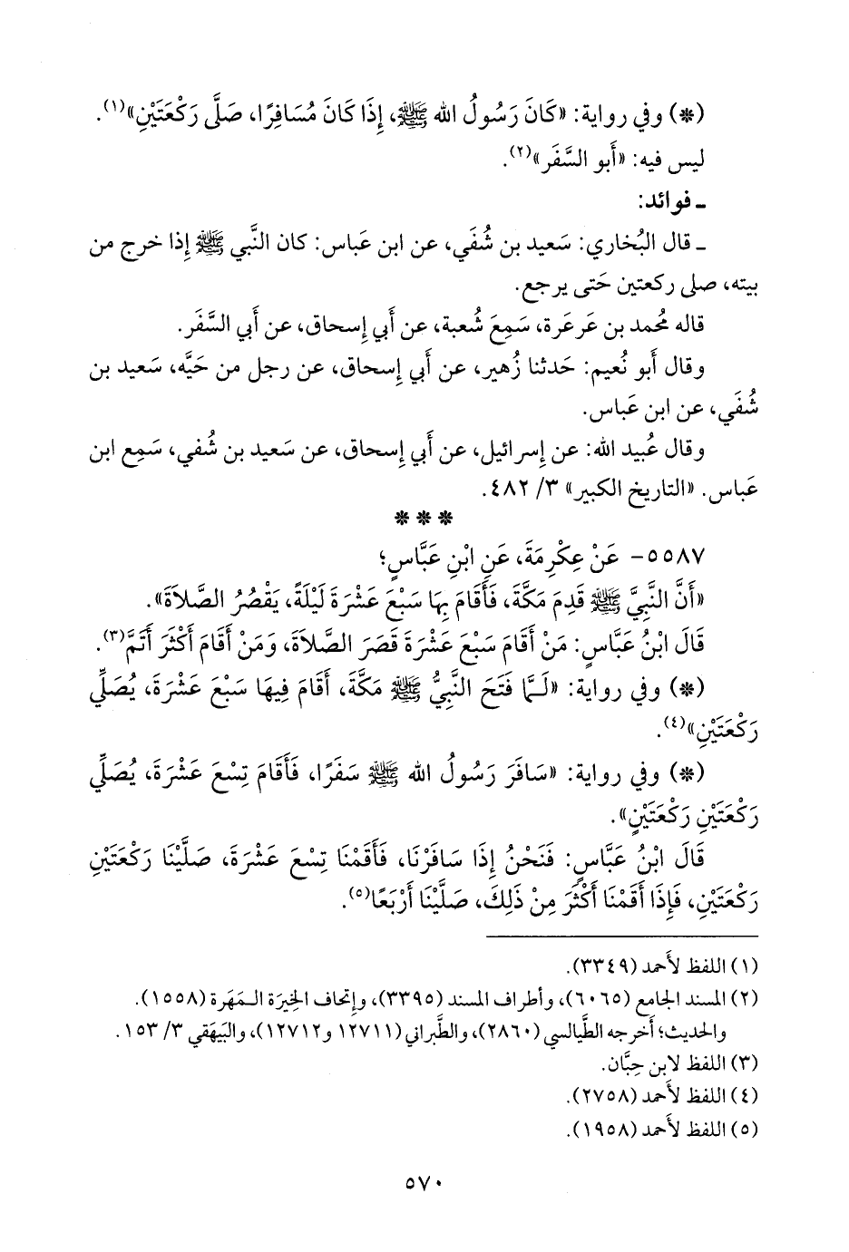 - وفي رواية: «سافر رسول الله صَلى الله عَليه وسَلم سفرا، فأقام تسع عشرة، يصلي ركعتين ركعتين».