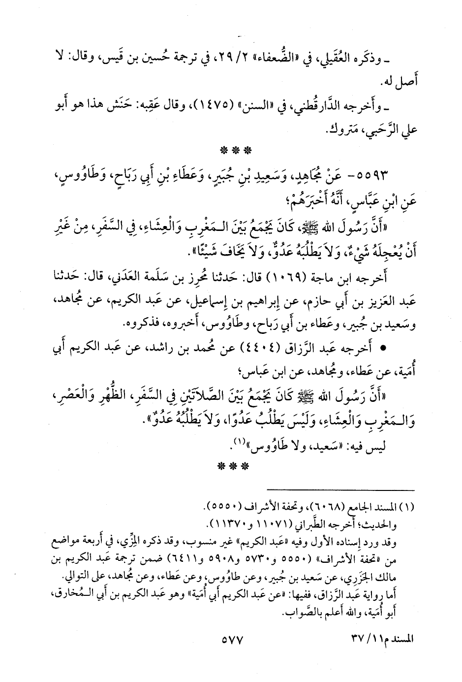 وقد ورد إسناده الأول وفيه «عبد الكريم» غير منسوب، وقد ذكره المزي، في أربعة مواضع من «تحفة الأشراف» (٥٥٥٠ و ٥٧٣٠ و ٥٩٠٨ و ٦٤١١) تحت ترجمة عبد الكريم بن مالك الجزري، عن سعيد بن جبير، وعن طاووس، وعن عطاء، وعن مجاهد، على التوالي، أما رواية عبد الرزاق، ففيها: «عن عبد الكريم أبي أُمية» وهو عبد الكريم بن أبي المخارق، أَبو أمية، والله أعلم بالصواب.
