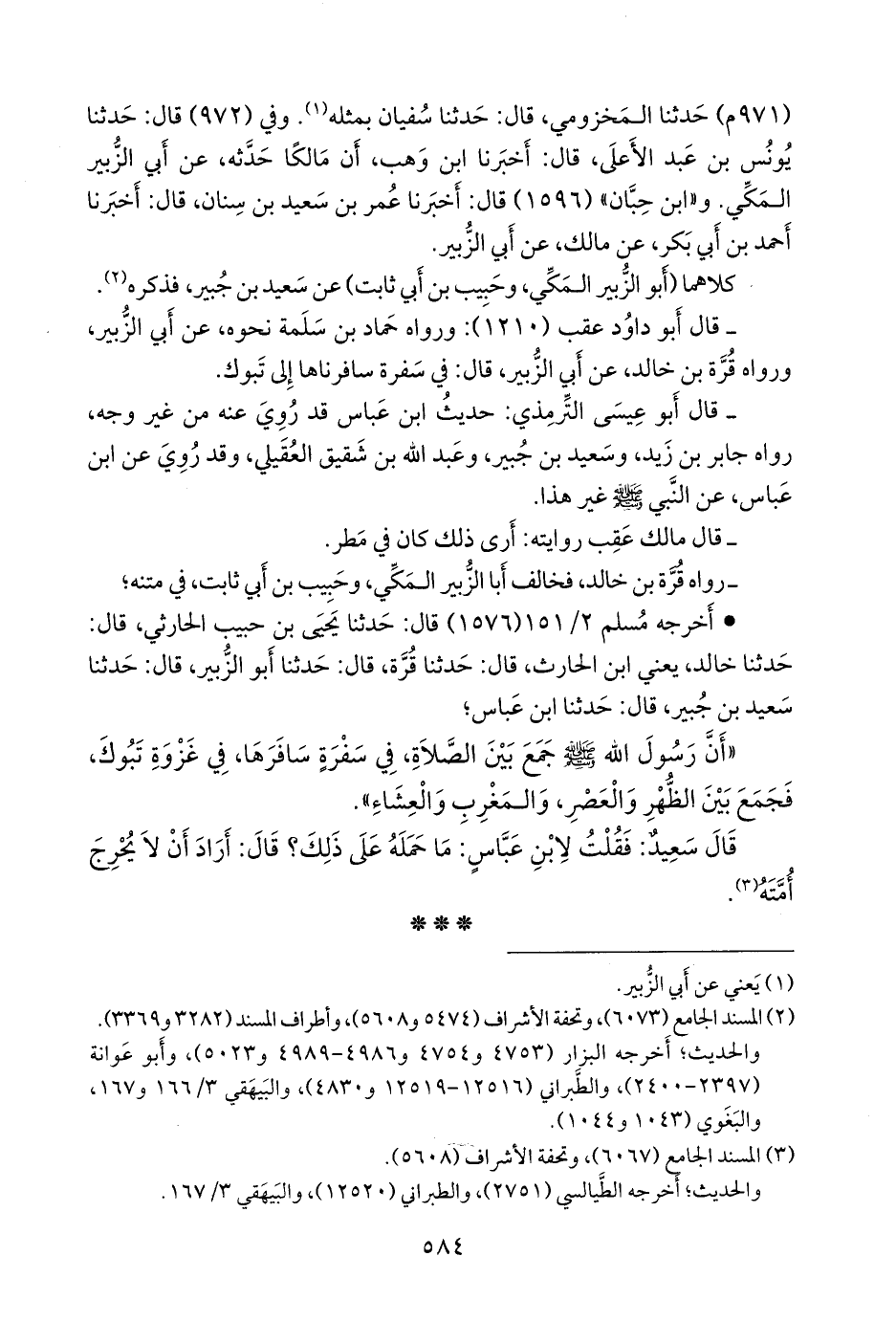 «أن رسول الله صَلى الله عَليه وسَلم جمع بين الصلاة، في سفرة سافرها، في غزوة تبوك، فجمع بين الظهر والعصر، والمغرب والعشاء».