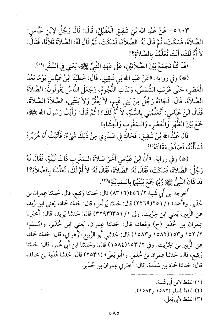- وفي رواية: «عن عبد الله بن شقيق، قال: خطبنا ابن عباس يوما بعد العصر، حتى غربت الشمس، وبدت النجوم، وجعل الناس يقولون: الصلاةَ، الصلاةَ، قال: فجاءه رجل من بني تميم، لا يفتر ولا ينثني، الصلاةَ، الصلاةَ. فقال ابن عباس: أتعلمني بالسنة، لا أم لك؟! ثم قال: رأيت رسول الله صَلى الله عَليه وسَلم جمع بين الظهر والعصر، والمغرب والعشاء».