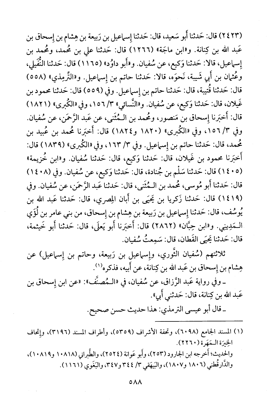 وفي (٥٥٩) قال: حدثنا محمود بن غَيلان، قال: حدثنا وكيع، عن سفيان. و «النَّسَائي» ٣/ ١٥٦، وفي «الكبرى» (١٨٢١) قال: أخبرنا إسحاق بن منصور، ومحمد بن المثنى، عن عبد الرَّحمَن، عن سفيان. وفي ٣/ ١٥٦، وفي «الكبرى» (١٨٢٠ و ١٨٢٤) قال: أخبرنا محمد بن عبيد بن محمد، قال: حدثنا حاتم بن إسماعيل. وفي ٣/ ١٦٣، وفي «الكبرى» (١٨٣٩) قال: أخبرنا محمود بن غَيلان، قال: حدثنا وكيع، قال: حدثنا سفيان. و «ابن خزيمة» (١٤٠٥) قال: حدثنا سَلْم بن جُنادة، قال: حدثنا وكيع، عن سفيان. وفي (١٤٠٨) قال: حدثنا أَبو موسى، محمد بن المثنى، قال: حدثنا عبد الرَّحمَن، عن سفيان. وفي (١٤١٩) قال: حدثنا زكريا بن يحيى بن أَبَان المصري، قال: حدثنا عبد الله بن يوسف، قال: حدثنا إسماعيل بن ربيعة بن هشام بن إسحاق، من بني عامر بن لؤي المديني. و «ابن حِبَّان» (٢٨٦٢) قال: أخبرنا أَبو يَعلى، قال: حدثنا أَبو خيثمة، قال: حدثنا يحيى القطان، قال: سمعت سفيان.