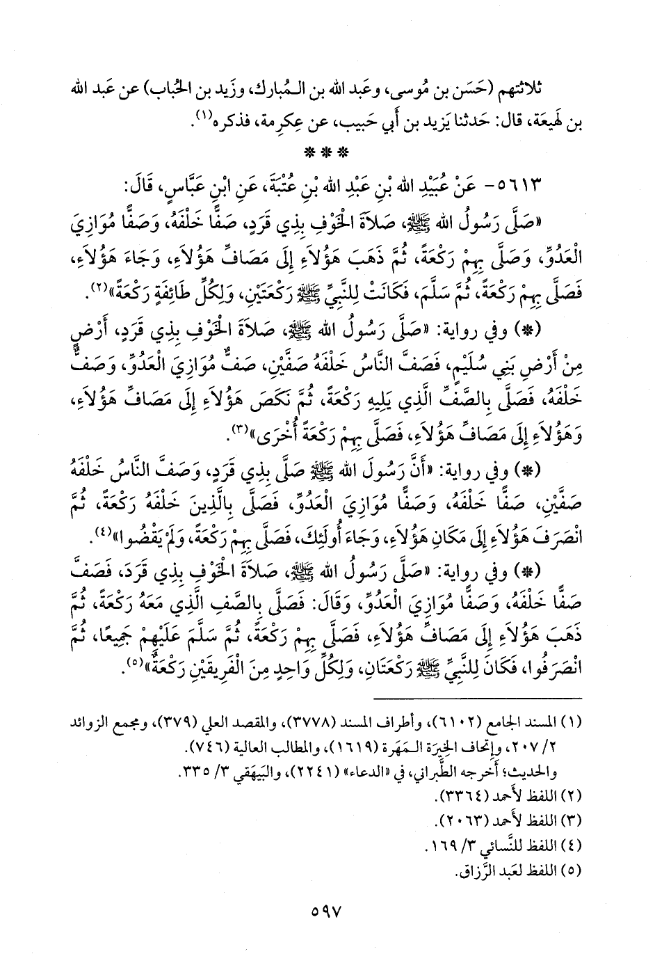 - وفي رواية: «صلى رسول الله صَلى الله عَليه وسَلم صلاة الخوف بذي قرد، فصف صفا خلفه، وصفا موازي العدو، وقال: فصلى بالصف الذي معه ركعة، ثم ذهب هؤلاء إلى مصاف هؤلاء، فصلى بهم ركعة، ثم سلم عليهم جميعا، ثم انصرفوا، فكان للنبي صَلى الله عَليه وسَلم ركعتان، ولكل واحد من الفريقين ركعة» (¬٤).