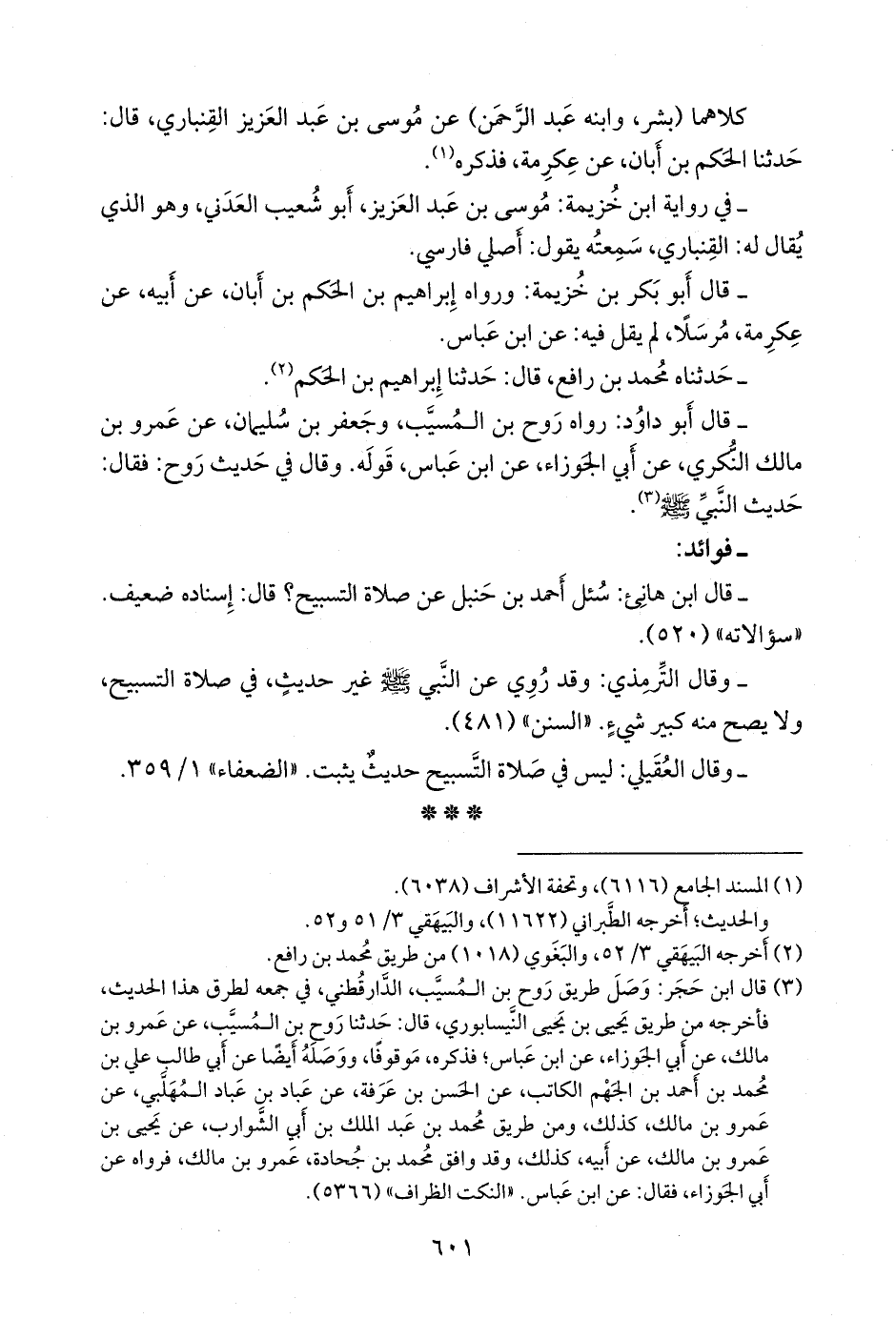 - وقال العُقيلي: ليس في صلاة التسبيح حديث يثبت. «الضعفاء» ١/ ٣٥٩.