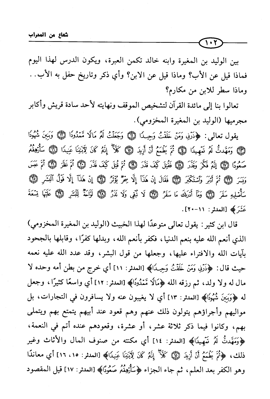 قال ابن كثير: يقول تعالى متوعدًا لهذا الخنيث (الوليد بن المغيرة المخزومي) الذي أنعم الله عليه بنعم الدنيا، فكفر بأنعم الله، وبدلها كفرًا، وقابلها بالجحود بآيات الله والافتراء عليها، وجعلها من قول البشر، وقد عدد الله عليه نعمه حيث قال: {ذَرْنِي وَمَنْ خَلَقْتُ وَحِيداً} أي خرج من بطن أمه وحده لا مال له ولا ولد، ثم رزقه الله {مَالاً مَّمْدُوداً} أي واسعًا كثيرًا، وجعل له {بَنِينَ شُهُوداً} أي لا يغيبون عنه ولا يسافرون في التجارات، بل مواليهم وأجراؤهم يتولون ذلك عنهم وهم قعود عند أبيهم يتمتع بهم ويتملى بهم، وكانوا فيما ذكر ثلاثة عشر، أو عشرة، وقعودهم عنده أتم في النعمة، {وَمَهَّدتُّ لَهُ تَمْهِيداً} أي مكنته من صنوف المال والأثاث وغير ذلك، {ثُمَّ يَطْمَعُ أَنْ أَزِيدَ (15) كَلاَّ إِنَّهُ كَانَ لآيَاتِنَا عَنِيداً} أي معاندًا وهو الكفر بعد العلم، ثم جاء الجزاء {سَأُرْهِقُهُ صَعُوداً} قيل المقصود