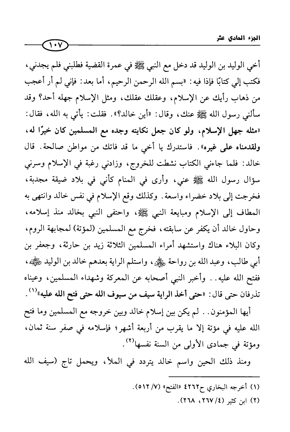 فقلت: يأتي به الله، فقال: «مثله جهل الإسلام، ولو كان جعل نكايته وجده مع المسلمين كان خيرًا له، ولقدمناه على غيره». فاستدرك يا أخي ما قد فاتك من مواطن صالحة. قال خالد: فلما جاءني الكتاب نشطت للخروج، وزادني رغبة في الإسلام وسرني سؤال رسول الله صلى الله عليه وسلم عني، وأرى في المنام كأني في بلاد ضيقة مجدبة، فخرجت إلى بلاد خضراء واسعة. وكذلك وقع الإسلام في نفس خالد وانتهى به المطاف إلى الإسلام ومبايعة النبي صلى الله عليه وسلم، واحتفى النبي بخالد منذ إسلامه، وحاول خالد أن يكفر عن سابقته، فخرج مع المسلمين (لمؤتة) لمجابهة الروم، وكان البلاء هناك واستشهد أمراء المسلمين الثلاثة زيد بن حارثة، وجعفر بن أبي طالب، وعبد الله بن رواحة، واستلم الراية بعدهم خالد بن الوليد، ففتح الله عليه .. وأخبر النبي أصحابه عن المعركة وشهداء المسلمين، وعيناه تذرفان حتى قال: «حتى أخذ الراية سيف من سيوف الله حتى فتح الله عليه» (¬1).